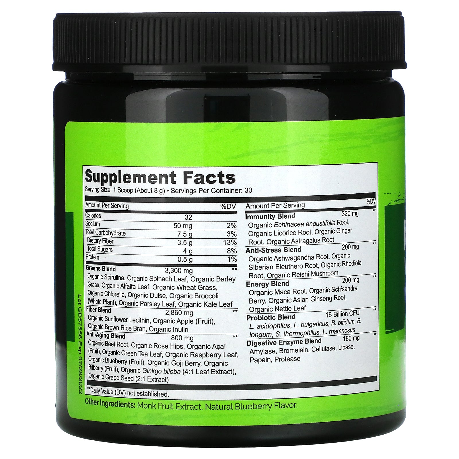 Serving Size: 1 Scoop (About 8 g) Serving Per Container: 30 Amount Per Serving %Daily Value Calories 32 Sodium 50 mg 2% Total Carbohydrate 7.5 g 3% Dietary Fiber 3.5 g 13% Total Sugars 4 g 8% Protein 0.5 g 1% Greens Blend Organic Spirulina, Organic Spinach Leaf, Organic Barley Grass, Organic Alfalfa Leaf, Organic Wheat Grass, Organic Chlorella, Organic Dulse, Organic Broccoli (Whole Plant), Organic Parsley Leaf, Organic Kale Leaf 3,300 mg * Fiber Blend Organic Sunflower Lecithin, Organic Apple (Fruit), Organic Brown Rice Brain, Organic Inulin 2,860 mg * Anti-Aging Blend Organic Beet Root, Organic Rose Hips, Organic Acai (Fruit), Organic Green Tea Leaf, Organic Raspberry Leaf, Organic Blueberry (Fruit), Organic Goji Berry, Organic Bilberry (Fruit), Organic Ginkgo biloba (4:1 Leaf Extract), Organic Gape Seed (2:1 Extract) 800 mg * Immunity Blend Organic Echinacea angustifolia Root, Organic Licorice Root, Organic Ginger Root, Organic Astragalus Root 320 mg * Anti-Stress Blend Organic Ashwagandha Root, Organic Siberian Eleuthero Root, Organic Rhodiola Root, Organic Reishi Mushroom 200 mg * Energy Blend Organic Maca Root, Organic Schisandra Berry, Organic Asian Ginseng Root, Organic Nettle Leaf 200 mg * Probiotic Blend L. acidophilus L. bulgaricus, B. bifidum, B. longum, S. thermophilus, L. rhamnosus 16 Billion CFU * Digestive Enzyme Blend Amylase, Bromelain, Cellulase, Lipase, Papain, Protease 180 mg * *Daily Value not establishedDisclaimer