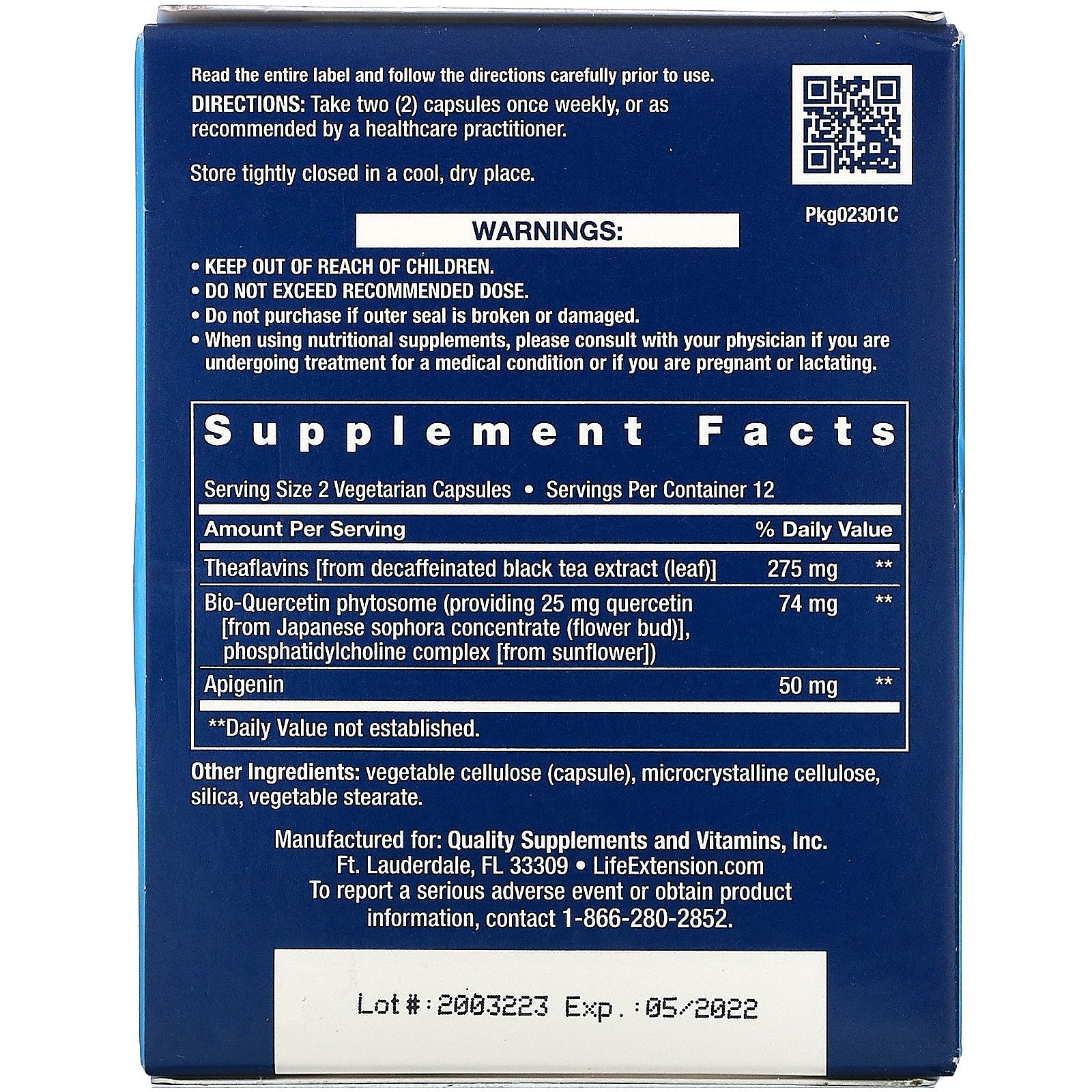 Serving Size: 2 Vegetarian Capsules Serving Per Container: 12 Amount Per Serving %Daily Value Theaflavins [from decaffeinated black tea extract (leaf)] 275 mg ** Bio-Quercetin phytosome (providing 25 mg quercetin [from Japanese sophora concentrate (flower bud)], phosphatidylcholine complex [from sunflower] 74 mg ** Apigenin 50 mg ** **Daily Value not established.Disclaimer