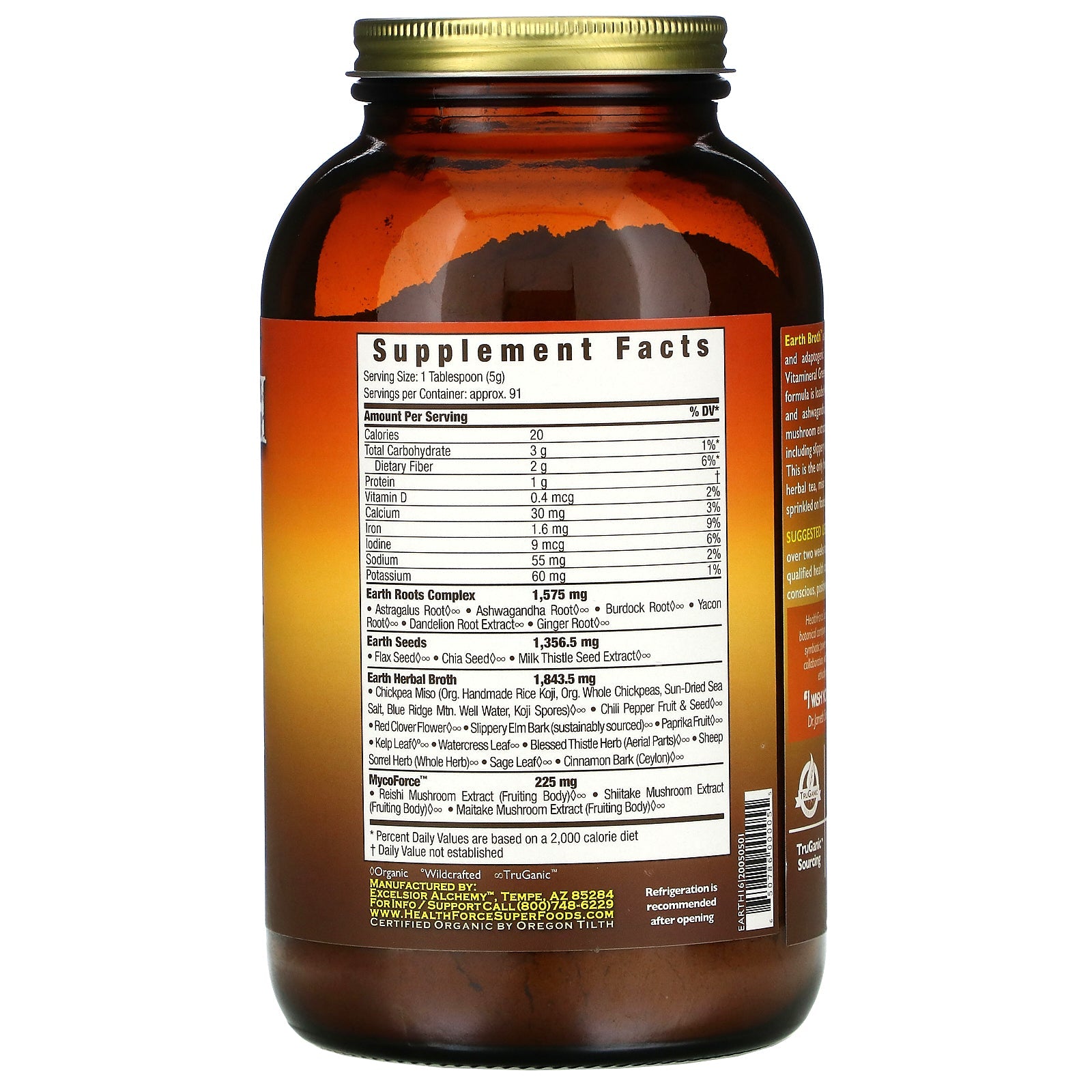 Serving Size: 1 Tablespoon (5 g) Servings Per Container: approx. 91 Amount Per Serving %Daily Value* Calories 20 Total Carbohydrates 3 g 1%* Dietary Fiber 2 g 6%* Protein 1 g † Vitamin D 0.4 mcg 2% Calcium 30 mg 3% Iron 1.6 mg 9% Iodine 9 mcg 6% Sodium 55 mg 2% Potassium 60 mg 1% Earth Roots Complex Astragalus Root♢∞, Ashwagandha Root♢∞, Burdock Root♢∞, Yacon Root♢∞, Dandelion Root Extract∞, Ginger Root♢∞ 1,575 mg Earth Seeds Flax Seed♢∞, Chia Seeds♢∞, Milk Thistle Seed Extract♢∞ 1,356.5 mg Earth Herbal Broth Chickpea Miso (Org. Handmade Rice Koji, Org. Whole Chickpeas, Sun-Dried Sea Salt, Blue Ridge Mtn. Well Water, Koji Spores)♢∞, Chili Pepper Fruit & Seed♢∞, Red Colver Flower♢∞, Slippery Elm Bark (sustainably sourced)∞, Paprika Fruit♢∞, Kelp Leaf♢°∞, Watercress Leaf∞, Blessed Thistle Herb (Aerial Parts)♢∞, Sheep Sorrel Herb (Whole Herb)∞, Sage Leaf♢∞, Cinnamon Bark (Ceylon)♢∞ 1,843.5 mg MycoForce™ Reishi Mushroom Extract (Fruiting Body)♢∞, Shiitake Mushroom Extract (Fruiting Body)♢∞, Maitake Mushroom Extract (Fruiting Body)♢∞ 225 mg *Percent Daily Values are based on a 2,000 calorie diet. †Daily Value not established. ♢Organic °Wildcrafted ∞TruGanic™Disclaimer
