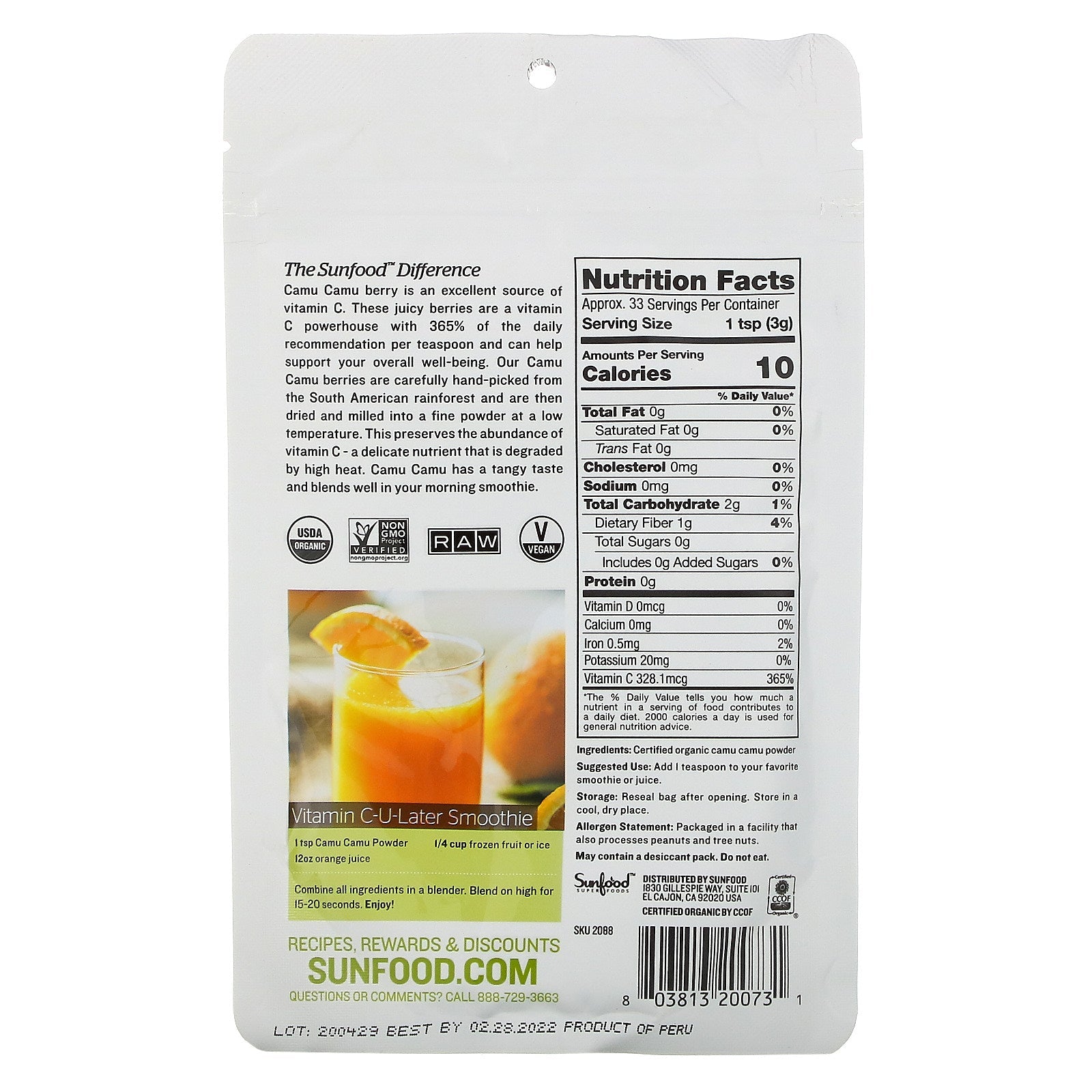 A Tangy Superfood Boost for Smoothies & Juices USDA Non-GMO Raw Vegan Gluten-Free Kosher Vitamin C-Immune System Antioxidants-Immune Support Vitamin B3-Metabolic Strength Non-GMO Project Verified Certified Camu Camu Powder An amazing superfruit, camu camu berries are an excellent source of Vitamin C, which may act as an antioxidant to contribute to healthy immune function. Traditionally, used by indigenous Amazonian people, camu camu also has vitamin B3 and potassium. These tiny berries pack a big punch to help aid in the body's overall health & vitality. The Sunfood Difference Our camu camu berries are carefully hand-picked from the South American rainforest, where they are low temperature processed into a fine powder. This preserves the abundance of Vitamin C, a delicate nutrient that is degraded by high heat. Raw, certified , non-GMO, and free of additives and fillers, our Camu Camu Powder is the highest quality available.Sugg. UseAdd 1/4-1/2 teaspoon to your...