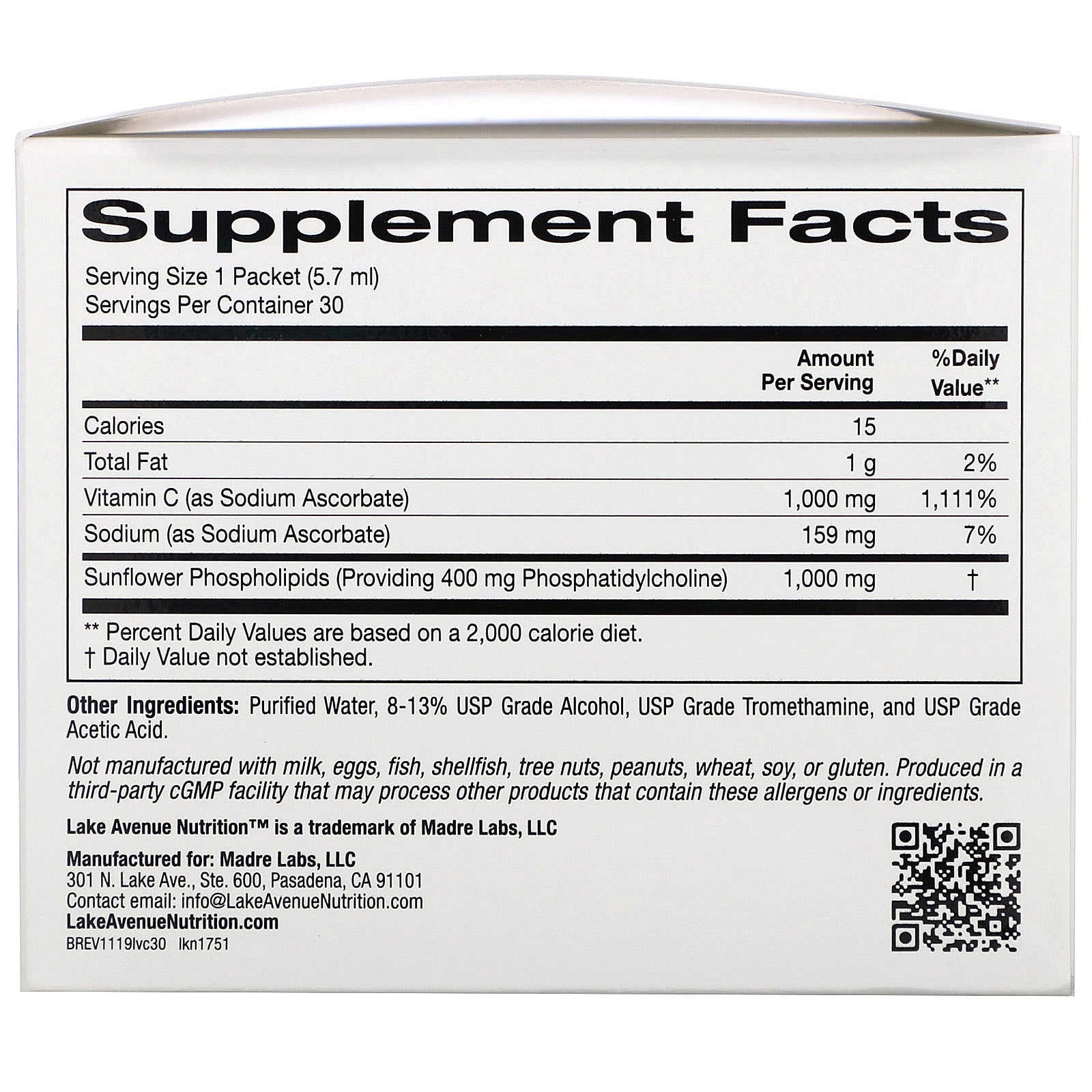 Serving Size: 1 Packet (5.7 ml) Serving Per Container: 30 Amount Per Serving %Daily Value** Calories 15 Total Fat 1 g 2% Vitamin C (as Sodium Ascorbate) 1,000 mg 1,111% Sodium (as Sodium Ascorbate) 159 mg 7% Sunflower Phospholipids (Providing 400 mg Phosphatidylcholine) 1,000 mg † **Percent Daily Values are based on a 2,000 calorie diet. †Daily Value not established.Disclaimer