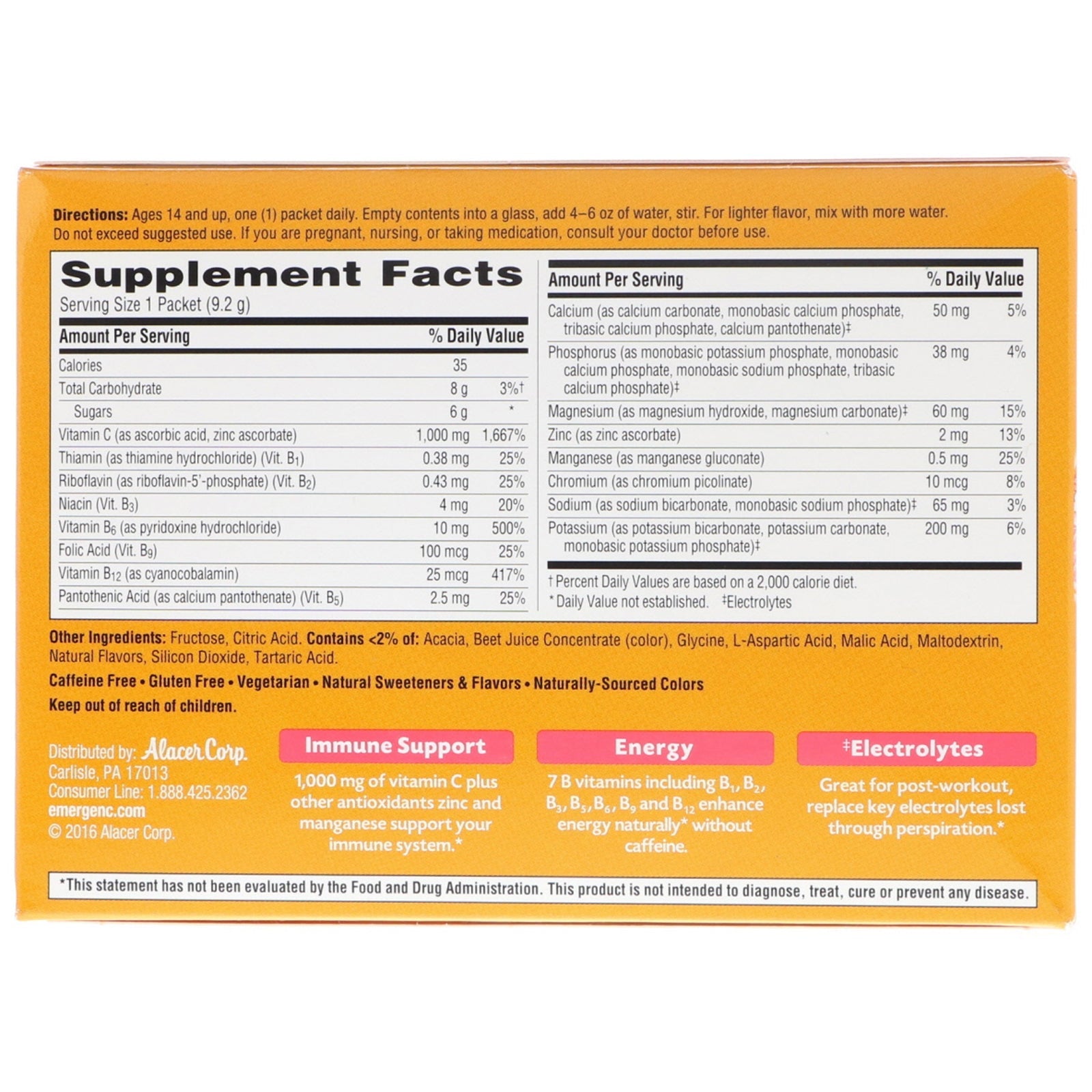 Serving Size: 1 packet (9.2 g) Servings per Container: 30 Amount Per Serving % DV Calories 35 Total Carbohydrate 8 g 3%† Sugars 6 g * Vitamin C (as ascorbic acid, zinc ascorbate) 1,000 mg 1,667% Thiamine (as thiamine hydrochloride) (Vit. B1) 0.38 mg 25% Riboflavin (as riboflavin 5'-phosphate sodium) (Vit. B2) 0.43 mg 25% Niacin (Vit. B3) 4 mg 20% Vitamin B6 (as pyridoxine hydrochloride) 10 mg 500% Folic Acid (Vit. B9) 100 mcg 25% Vitamin B12 (as cyanocobalamin) 25 mcg 417% Pantothenic Acid (as calcium pantothenate) (Vit. B5) 2.5 mg 25% Calcium (as calcium carbonate, monobasic calcium phosphate, tribasic calcium phosphate, calcium pantothenate)‡ 50 mg 5% Phosphorus (as monobasic potassium phosphate, monobasic calcium phosphate, monobasic sodium phosphate, tribasic calcium phosphate)‡ 38 mg 4% Magnesium (as magnesium hydroxide, magnesium carbonate)‡ 60 mg 15% Zinc (as zinc ascorbate) 2 mg 13% Manganese (as manganese gluconate) 0.5 mg 25% Chromium (as Chromium picolinate) 10 mcg 8% Sodium (as sodium bicarbonate, monobasic sodium phosphate)‡ 65 mg 3% Potassium (as potassium bicarbonate, potassium carbonate, monobasic potassium phosphate)‡ 200 mg 6% † Percent Daily Values are based on a 2,000 calorie diet. * Daily Value not established. ‡ElectrolytesDisclaimer