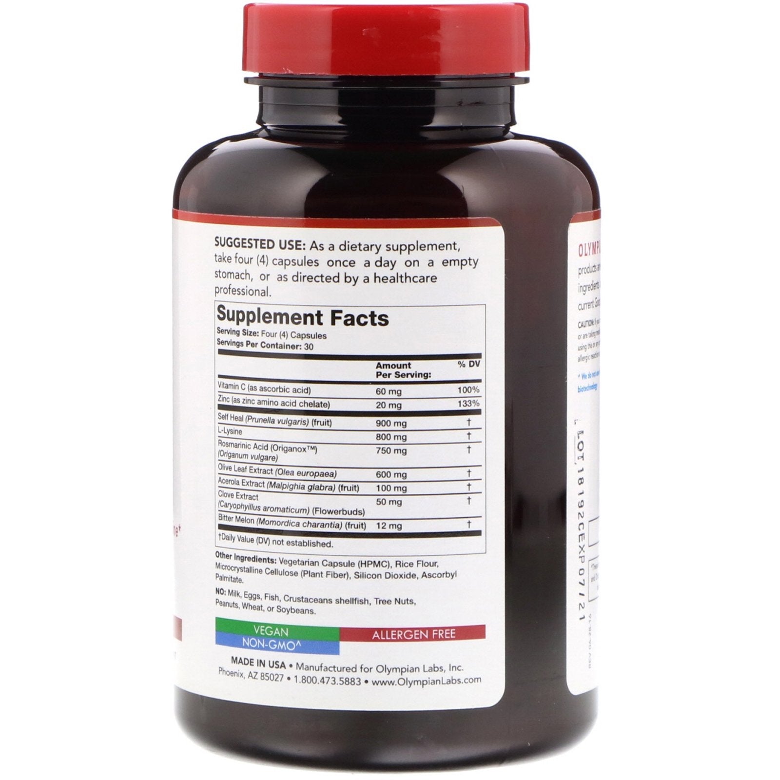 Immune Boosting Support Vegan Allergen Free Non GMO^ Fortified with Vitamin C, Zinc & Lysine Supports Healthy Immune System Aids Healing 30 Servings Dietary Supplement Olympian Labs, Inc. products are made with the highest quality ingredients and manufactured according to current Good Manufacturing Practices (cGMP). ^We do not use ingredients that were produced using modern biotechnology.Sugg. UseAs a dietary supplement, take four (4) capsules once a day on an empty stomach, or as directed by a healthcare professional.Other IngredientsVegetarian capsule (HPMC), rice flour, microcrystalline cellulose (plant fiber), silicon dioxide, ascorbyl palmitate. No: Milk, eggs, fish, crustaceans shellfish, tree nuts, peanuts, wheat or soybeans.Supplement FactsServing Size: Four (4) Capsules Servings Per Container: 30 Amount Per Serving % DV Vitamin C (as ascorbic acid) 60 mg 100% Zinc (as zinc amino acid chelate) 20 mg 133% Self Heal (Prunella vulgaris) (fruit) 900 mg † L-Lysine 800 mg † Rosmarinic Acid (Origanox) (Origanum...