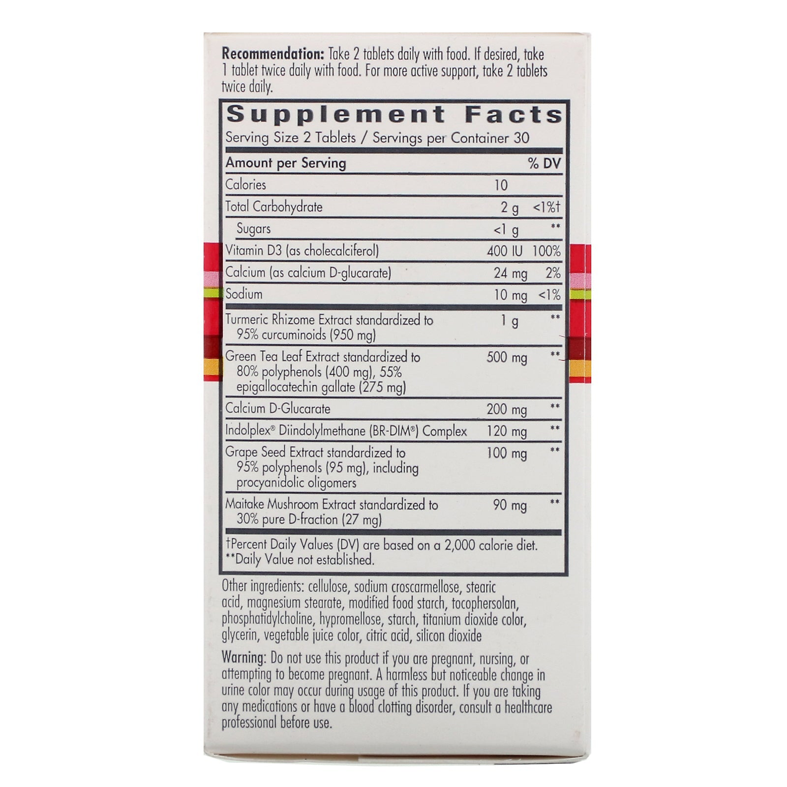 Dietary Supplement Gluten Free Certain nutrients from food provide protection benefits for breast health, but getting all of these nutrients from our daily diet can be difficult, so we created Protective Breast Formula dietary supplement to make it simple.Sugg. UseTake 2 tablets daily with food. If desired, take 1 tablet twice daily with food. For more active support, take 2 tablets twice daily.Other IngredientsCellulose, sodium croscarmellose, stearic acid, magnesium stearate, modified food starch, tocophersolan, phosphatidylcholine, hypromellose, starch, titanium dioxide color, glycerin, vegetable juice color, citric acid, silicon dioxide. No yeast, wheat, dairy products, artificial flavors, or preservatives.Supplement FactsServing Size: 2 tablets Servings per container: 30 Amount per Serving % Daily Value Calories 10 Total Carbohydrate 2 g <1%† Sugars <1 g ** Vitamin D3 (as cholecalciferol) 400 IU 100% Calcium (as Calcium D-glucarate) 24 mg 2% Sodium 10 mg <1% Turmeric Rhizome Extract standardized to 95% curcuminoids (950 mg) 1...