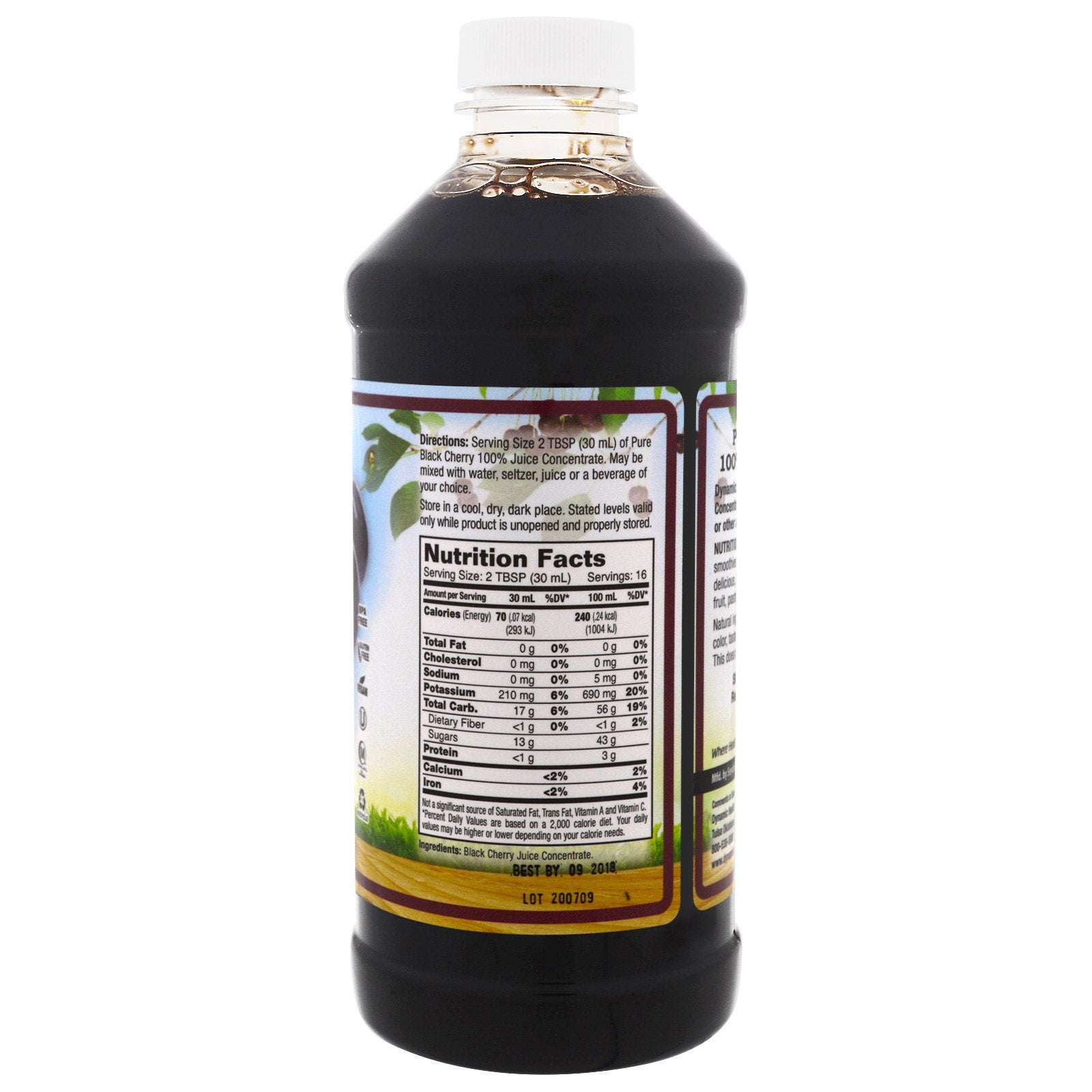 Gluten Free 100% Juice Concentrate BPA Free Vegan Where Health & Flavor Meet! HalalSugg. UseServing Size: 2 tbsp (30 ml) of pure black cherry 100% juice concentrate. May be mixed with water, seltzer, juice or a beverage of your choice. Healthy Suggestions: Ideal for tropical smoothies, fruit cocktails & as a mixer. A delicious, natural topping for yogurt, ice cream, fruit, pastry and dessert.Other IngredientsBlack cherry 100% juice concentrate.Supplement FactsServing Size: 2 tbsp (30 ml) Servings: 16 Amount per serving 30 ml %DV** 100 ml %DV** Calories (Energy) 70 (.07 kcal)(293 kj) 240 (.24 kcal)(1004 kj) Total Fat 0 g 0% 0 g 0% Cholest. 0 mg 0% 0 mg 0% Sodium 0 mg 0% 5 mg 0% Potassium 210 mg 6% 690 mg 20% Total Carb. 17 g 6% 56 g 19% Dietary Fiber <1g 0% <1 g 2% Sugars 13 g 43 g Protein <1 g 3 g...