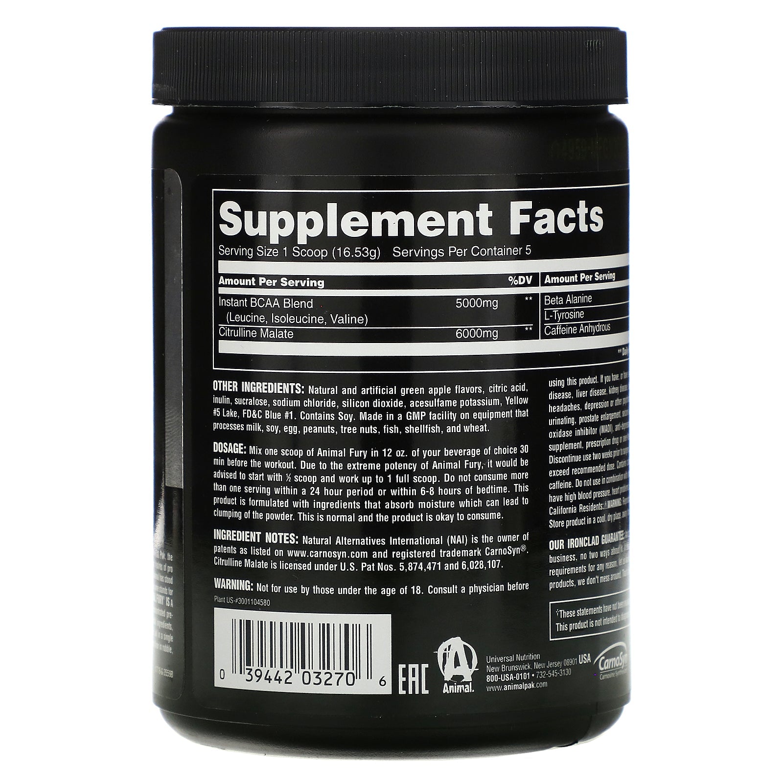 Bring The Pain Dietary Supplement The Complete Pre-Workout Stack Raw Energy Powerful Pumps Unbridled Focus Pure Power CarnoSyn - Carnosine Synthesizer Who We Are In 1983, Animal was founded with the birth of Animal Pak, the venerable training "pack" that started it all. Born from the needs and desires of pro bodybuilders, Animal has grown prodigiously over the decades. Today, Animal has stood the test of time and been proven in the trenches day in and day out. The name stands for trust, integrity and a no nonsense approach to the game. What Animal Fury Is A powder keg of power, Animal Fury is intended to bring the pain. A concentrated pre-training formula loaded with efficacious dosages of the most impactful ingredients, Animal Fury is charged with everything the hardest training demands, all in a simple scoop. When it is time to blast the heavy iron and leave the weight room floor in rubble, Animal Fury lights the fuse. Our Ironclad Guarantee: Animal is dedicated to being the best in the business, no two ways about. if this product doesn't meet with your tough requirements for any reason, let us know. When it comes to standing behind our products, we don't mess around. That's the truth.