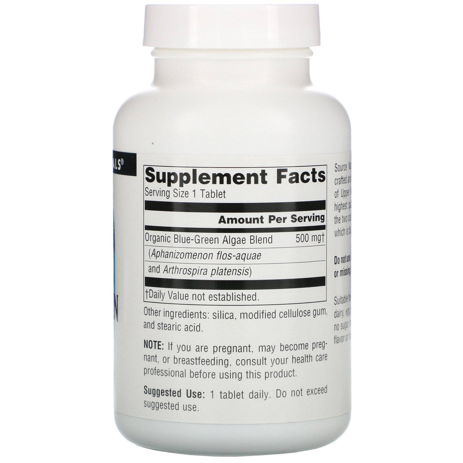 Freeze Dried From Klamath Lake Dietary Supplement 500 mg Source Naturals Blue-Green Algae is wildcrafted and harvested in the prime upper regions of Upper Klamath Lake, Oregon, and is of the highest quality available. Its name comes from the two color pigments it contains, phycocyanin, which is blue, and chlorophyll, which is green. Blue-Green Algae also contains significant levels of vitamins, minerals and rich pigment nutrients.Sugg. Use2 tablets daily, preferably on an empty stomach.Other IngredientsColloidal silicon dioxide, modified cellulose gum, and stearic acid. Suitable for vegetarians. Contains no dairy, egg, gluten, corn, soy or wheat. Contains no sugar, starch, salt, preservatives, or artificial color, flavor or fragrance.Supplement FactsServing Size: 2 Tablets Servings Per Container: 100 Amount Per Serving %DV Protein 1 g <2%* Blue-Green Algae (Aphanizomenon flos-aquae) 1 g † Yielding approximately**: Vitamin A (as beta-carotene) 500 IU 10% Niacin 3.5 mg 18% Vitamin B-12 0.25 mcg 4% Iron 400...