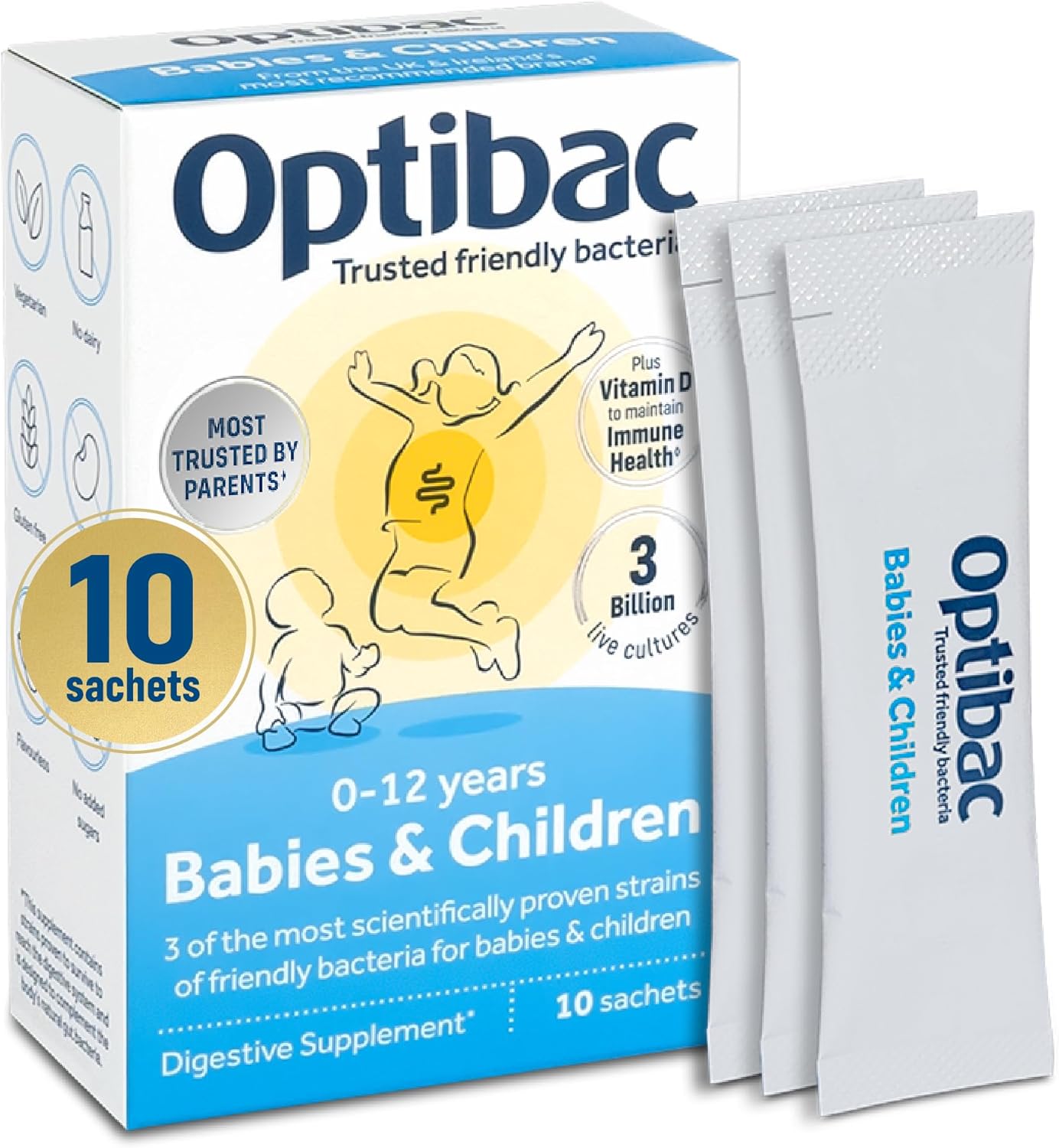Optibac Babies & Children has been created especially for kids and is well-loved by parents and children alike. Our brand-new formulation contains three well-researched strains of natural friendly bacteria: Lactobacillus rhamnosus GG®, thought to be the most scientifically studied strain of friendly bacteria in the world, Bifidobacterium breve M-16V®, and L. rhamnosus HN001. What’s more, Babies & Children now contains vitamin D3, the most desired added ingredient by surveyed parents, to help maintain immune health. 70% of the immune system is in the gut, making this the perfect support for your little ones. Suggested for daily use, each sachet provides 3 billion live microorganisms, 2.5mcg of vitamin D3, and 0.5g of FOS fibres (Fructooligosaccharides) to increase natural gut bacteria, guaranteed until the end of expiry. These strains have been clinically trialled in babies and school-age children and proven to survive to reach the gut alive, where the live cultures strains will complement the natural gut bacteria. It is free from sugars, artificial flavours and colourings which can be found in other children's supplements and foods containing live cultures. Optibac Babies & Children is suitable for use from birth to 12 years old. It is also suitable for vegetarians and is dairy and gluten free. Each pack contains 10 sachets.