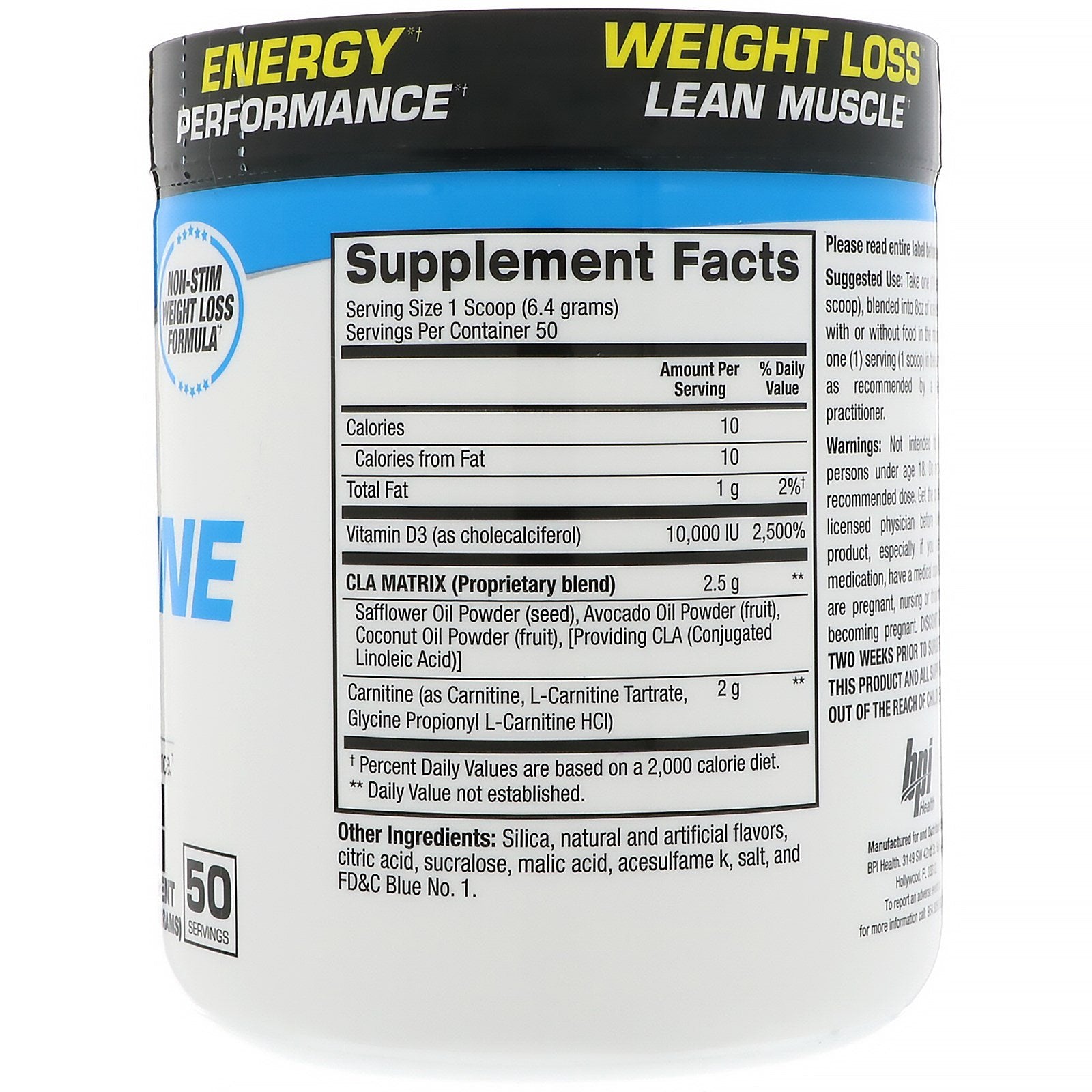 Serving Size: 1 Scoop (6.4 grams) Servings Per Container: 50 Amount Per Serving %Daily Value Calories 10 Calories from Fat 10 Total Fat 1 g 2%† Vitamin D3 (as cholecalciferol) 10,000 IU 2,500% CLA Matrix (Proprietary blend) Safflower Oil Powder (seed), Avocado Oil Powder (fruit), Coconut Oil Powder (fruit), [Providing CLA (Conjugated Linoleic Acid)] 2.5 g ** Carnitine (as Carnitine, L-Carnitine Tartrate, Glycine Propionyl L-Carnitine HCI) 2 g ** † Percent Daily Values are based on a 2,000 calorie diet. ** Daily Value not established.Disclaimer