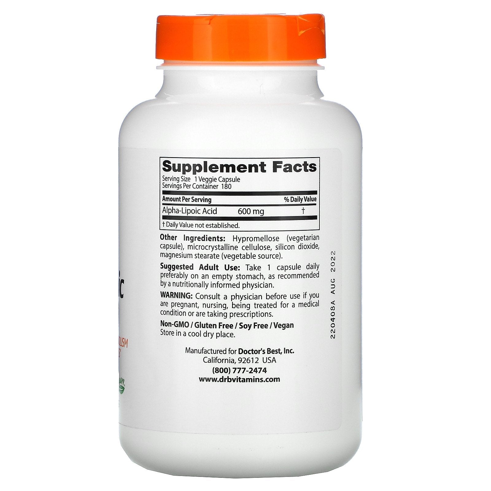 Doctor's Best, Alpha-Lipoic Acid 600, 600 mg, 180 Veggie Caps