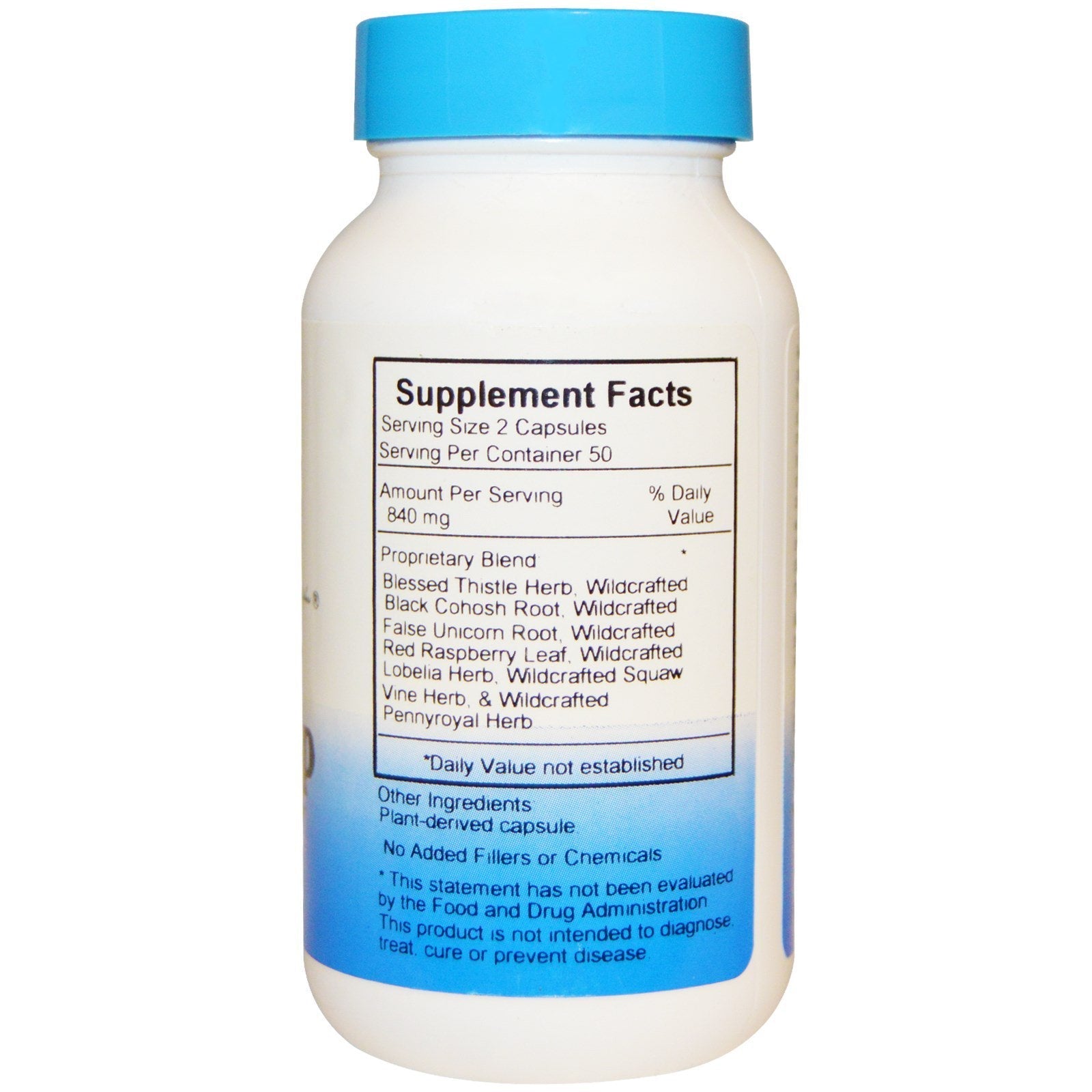 Serving Size: 2 Capsules Servings per container: 50 Amount Per Serving %DV Proprietary Blend: Blessed Thistle Herb, Wildcrafted Black Cohosh Root Wildcrafted False Unicorn Root Wildcrafted Red Raspberry Leaf Wildcrafted Lobelia Herb Wildcrafted Squaw Vine Herb, & Wildcrafted Pennyroyal Herb 840 mg * * Daily Value not established.