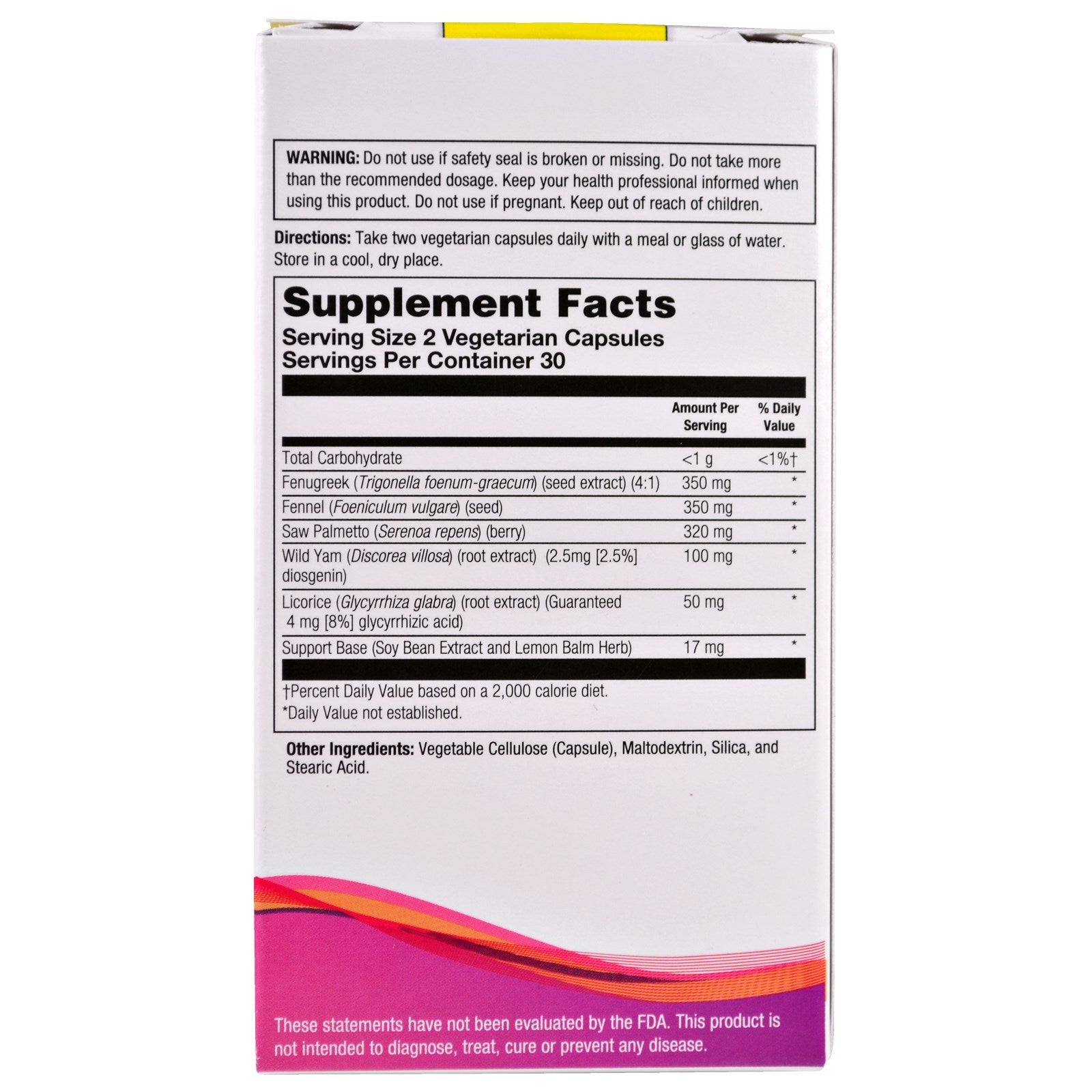 Serving Size: 2 Vegetarian Capsules Servings Per Container: 30 Amount Per Serving % Daily Value* Total Carbohydrate <1 g <1%† Fenugreek (Trigonella foenum-graecum) (seed extract) (4:1) 350 mg * Fennel (Foeniculum vulgare) (seed) 350 mg * Saw Palmetto (Serenoa repens) (berry) 320 mg * Wild Yam (Discorea villosa) (root extract) (2.5 mg [2.5%] diosgenin) 100 mg * Licorice (Glycyrrhiza glabra) (root extract) (Guaranteed 4 mg [8%] glycyrrizic acid) 50 mg * Support Base (Soy Bean Extract and Lemon Balm Herb) 17 mg * † Percent Daily Values are based on a 2,000 calorie diet. *Daily Value not established.Disclaimer