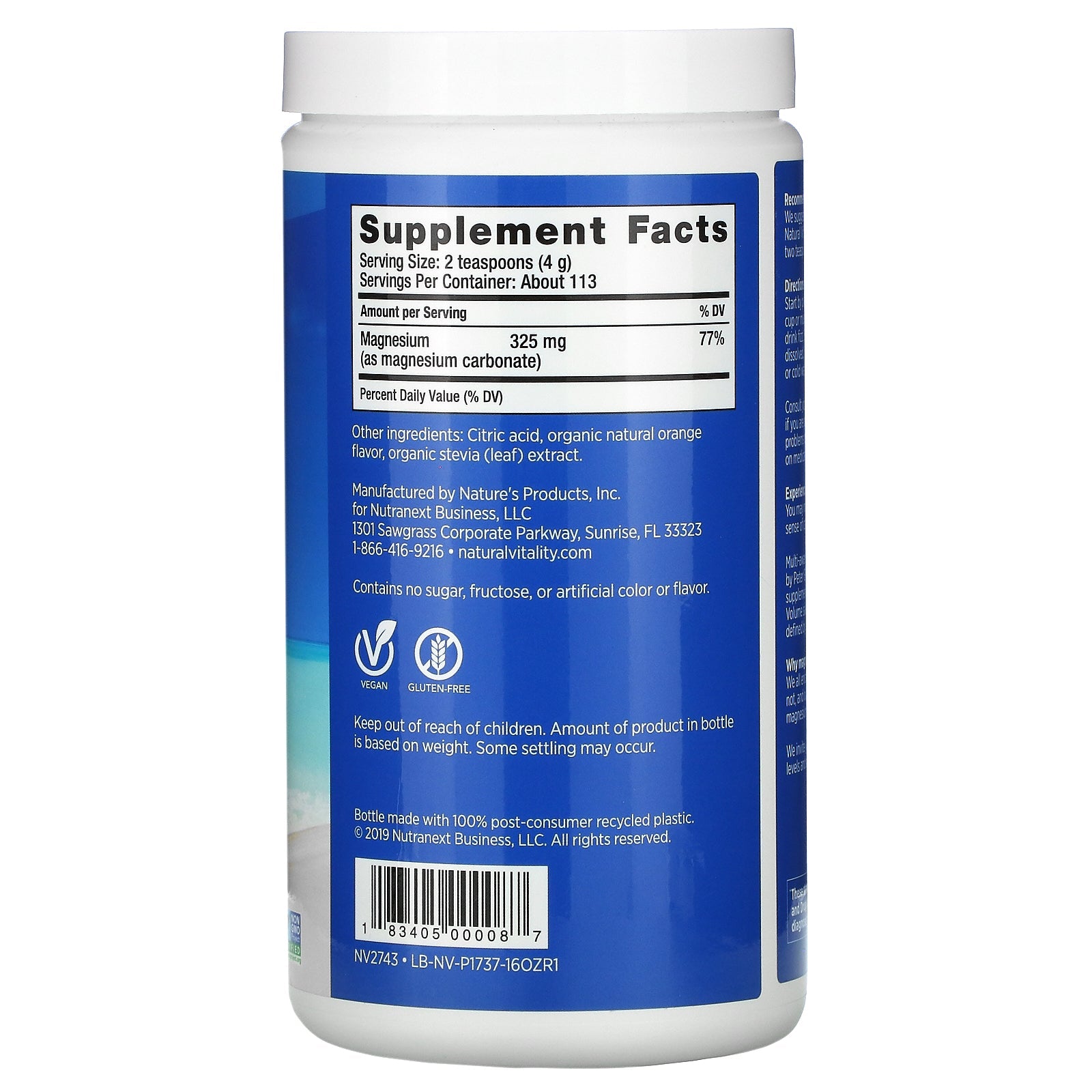 A Magnesium Supplement Non-GMO Project Verified Vegan Gluten-Free Experience CALM: You may notice muscles relaxing and an overarching sense of calmfulness. Multi-award-winning Natural Vitality CALM™, developed by Peter Gillham, is the best-selling magnesium supplement in the natural products market. (April 2019 Volume sales data for Natural Products market as defined by SPINS). Why magnesium? We all encounter stress daily whether we realize it or not, and our bodies can respond by depleting our magnesium levels. We invite you to help replenish your body's magnesium levels and enjoy the wave of calmfulness.Sugg. UseRecommended Use for Adults: We suggest starting out with half a teaspoon (1 g) of Natural Vitality CALM™ powder, gradually increasing to two teaspoons (4 g) daily. Directions: Start by placing your desired amount of powder into a cup or mug, add 2-3 ounces of warm water and let your drink fizz. Stir the drink until the powder is...