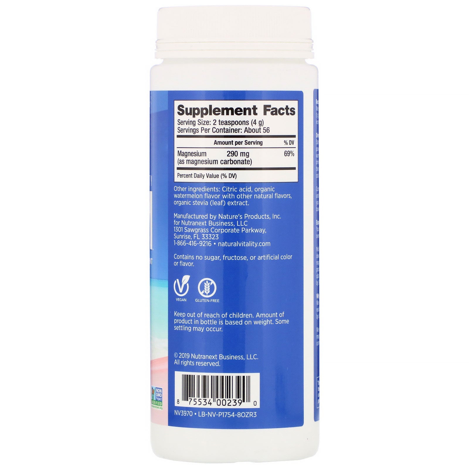 Natural Vitality A Magnesium Supplement With Other Natural Flavors Non GMO Project Verified Vegan Gluten Experience Calm: Your may notice muscles relaxing and an overarching sense of calmfulness. Multi-award-winning Natural Vitality Calm®, developed by Peter Gillham, is the best-selling magnesium supplement in the natural products market. (April 2019 Volume sales data for Natural Products markets as defined by SPINS). Why magnesium? We all encounter stress daily whether we realize it or not, and our bodies can respond by depleting our magnesium levels. We invite you to help replenish your body's magnesium levels and enjoy the wave of calmfulness.Sugg. UseRecommended Use for Adults: We suggest starting out with half a teaspoon (1 g) of Natural Vitality Calm™ powder, gradually increasing to two teaspoons (4 g) daily. Start by placing your desired amount of powder into a cup or mug, add 2-3 ounces of warm water and let your drink fizz. Stir...