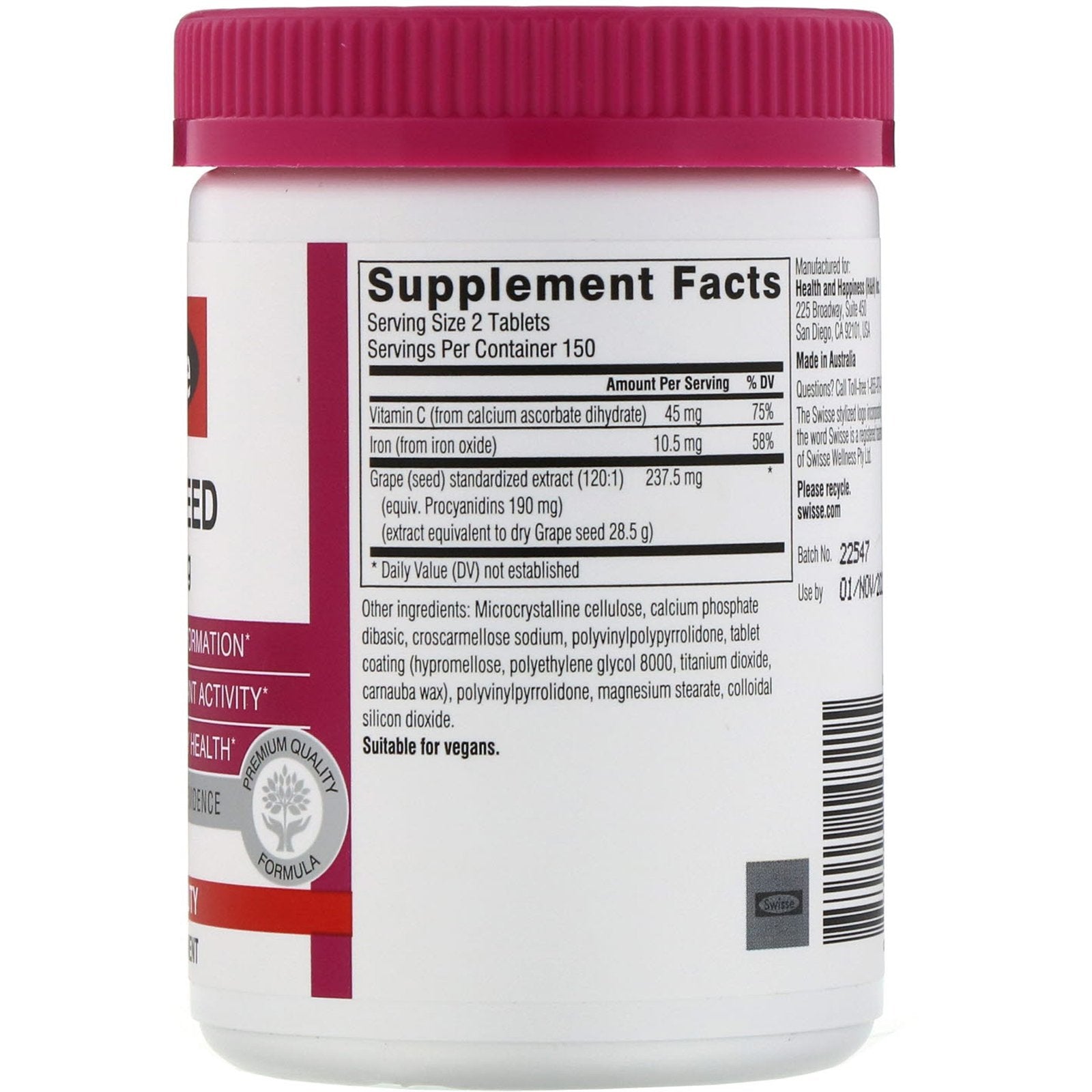 Serving Size: 2 Tablets Servings Per Container: 150 Amount Per Serving % DV Vitamin C (from calcium ascorbate dihydrate) 45 mg 75% Iron (from iron oxide) 10.5 mg 58% Grape (seed) standardized extract (120:1) (equiv. Procyanidins 190 mg) (extract equivalent to dry Grape seed 28.5 g) 237.5 mg * * Daily Value (DV) not established.Disclaimer