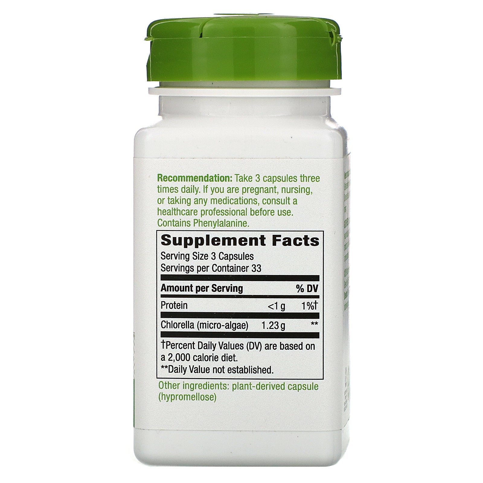 Since 1969 Superfood Nutrient Certified Authentic Tru-ID™ 1,230 mg Per Serving Dietary Supplement Vegan Superfood Nutrient At Nature's Way®, we believe nature knows best. That's why our mission is to seek out the best herbs the earth has to give. We will go to any continent or country to find where herbs grow best, so we can bring you the purest botanicals possible. It's the way we deliver uncompromising quality and the way to help you live healthier. It's not just our way. It's Nature's Way.™Sugg. UseTake 3 capsules three times daily.Other IngredientsPlant-derived capsule (hypromellose). Gluten free. No sugar, salt, yeast, wheat, soy, corn, dairy products, artificial colors, flavors or preservatives.Supplement FactsServing Size: 3 Capsules Servings Per Container: 33 Amount Per Serving %Daily Value Protein <1 g 1%† Chlorella (micro-algae) 1.23 g ** †Percent Daily Values (DV) are based on a 2,000 calorie diet. **Daily Value not established.DisclaimerWhile VitaminsUK strives...