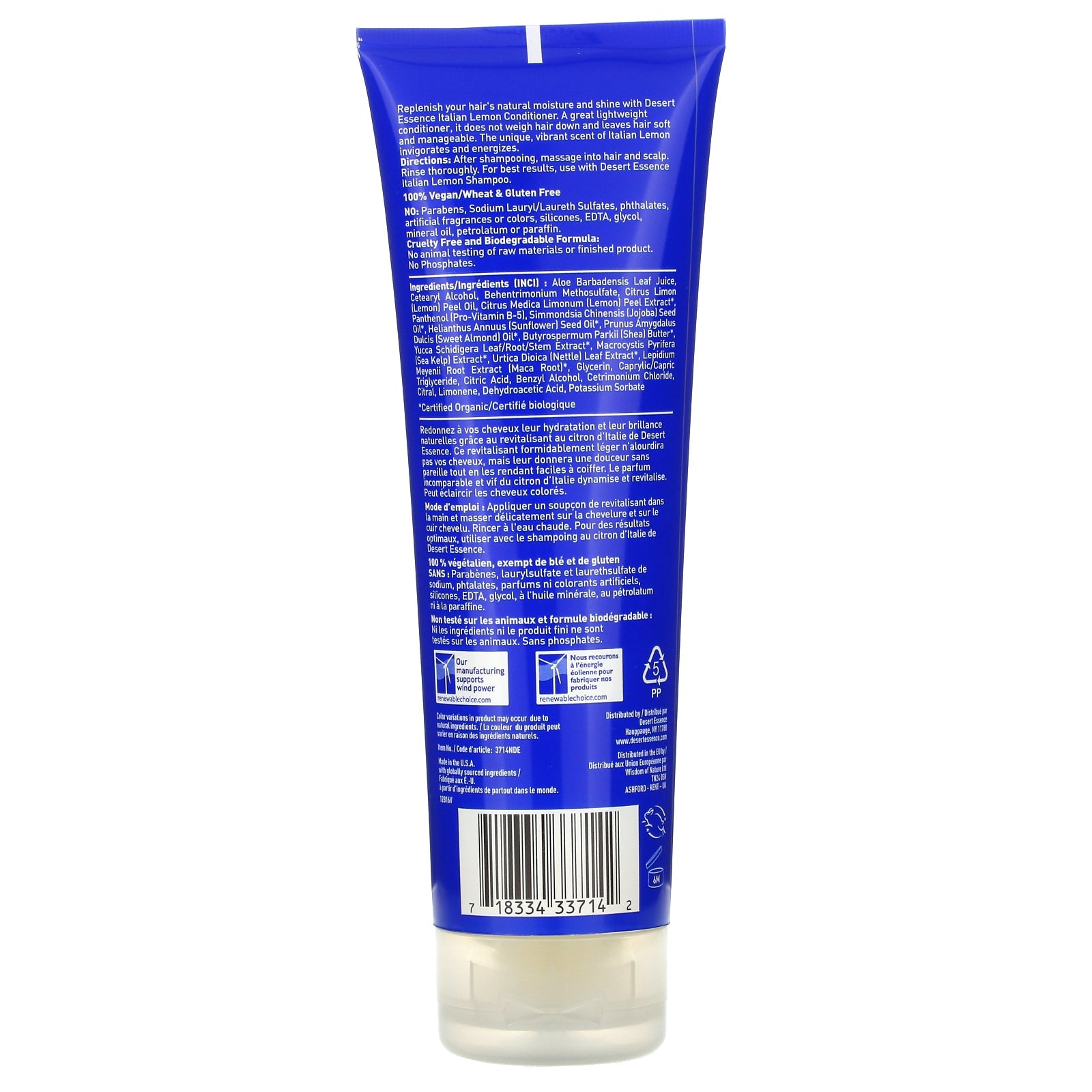Revitalizing 100% Vegan/Wheat & Gluten Free Cruelty Free and Biodegradable Formula No Animal Testing of Raw Materials or Finished Product No Phosphates Leaping Bunny Replenish your hair's natural moisture and shine with Desert Essence Italian Lemon Co