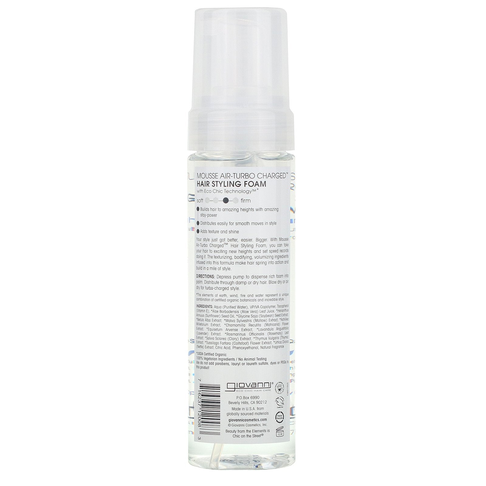 Eco Chic Technology ™ Medium-to-Firm Hold Natural Infusion Texturizes While Adding Body and Volume to Hair Salon-Quality Color-Safe Family Owned and Operated Since 1979 Eco Chic Hair Care Beauty from the Elements is Chic on the Street Natural Infusion texturizes while adding body and volume to hair. Mousse Air-Turbo Charged ™ Hair Styling Foam with Eco Chic Technology ™ * Builds hair to amazing heights with amazing stay-power Distributes easily for smooth moves in style Adds texture and shine Your style just got better, easier. Bigger. With Mousse Air-Turbo Charged ™ Hair Styling Foam, you can take your hair to exciting new heights and set speed records doing it. The texturizing, bodifying, volumizing ingredients infused into this formula make hair spring into action and build in a mile of style. *The elements of earth, wind, fire and water represent a unique combination of certified organic botanicals and incredible style.