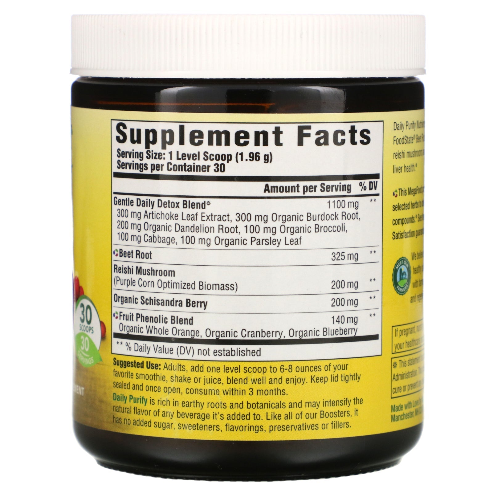 Fresh From Farm to Powder™ With Dandelion, Schisandra Berry & Artichoke Leaf Unsweetened Powder Dietary Supplement 30 Scoops Certified B Corporation - Business for Good Non GMO Project Verified Glyphosate Residue Free Tested 125+ Pesticides & Herbicides NSF - Certified Gluten-Free Certified Vegan Kosher Dairy Free Soy Free Daily Purify Nutrient Booster Powder contains farm-fresh FoodState® Beet Root and Fruit Phenolic Blend combined with reishi mushroom and schisandra berry to nourish and replenish live health.Sugg. UseAdults, add one level scoop to 6-8 ounces of your favorite smoothie, shake or juice, blend well and enjoy. Daily Purify is rich in earthy roots and botanicals and may intensify the natural flavor of any beverage it's added to.Other IngredientsLike all of our Boosters, it has no added sugar, sweeteners, flavorings, preservatives or fillers.Supplement FactsServing Size: 1 Level Scoop (1.96 g) Servings Per Container: 30 Amount per Serving % Daily Value Gentle Daily Detox...