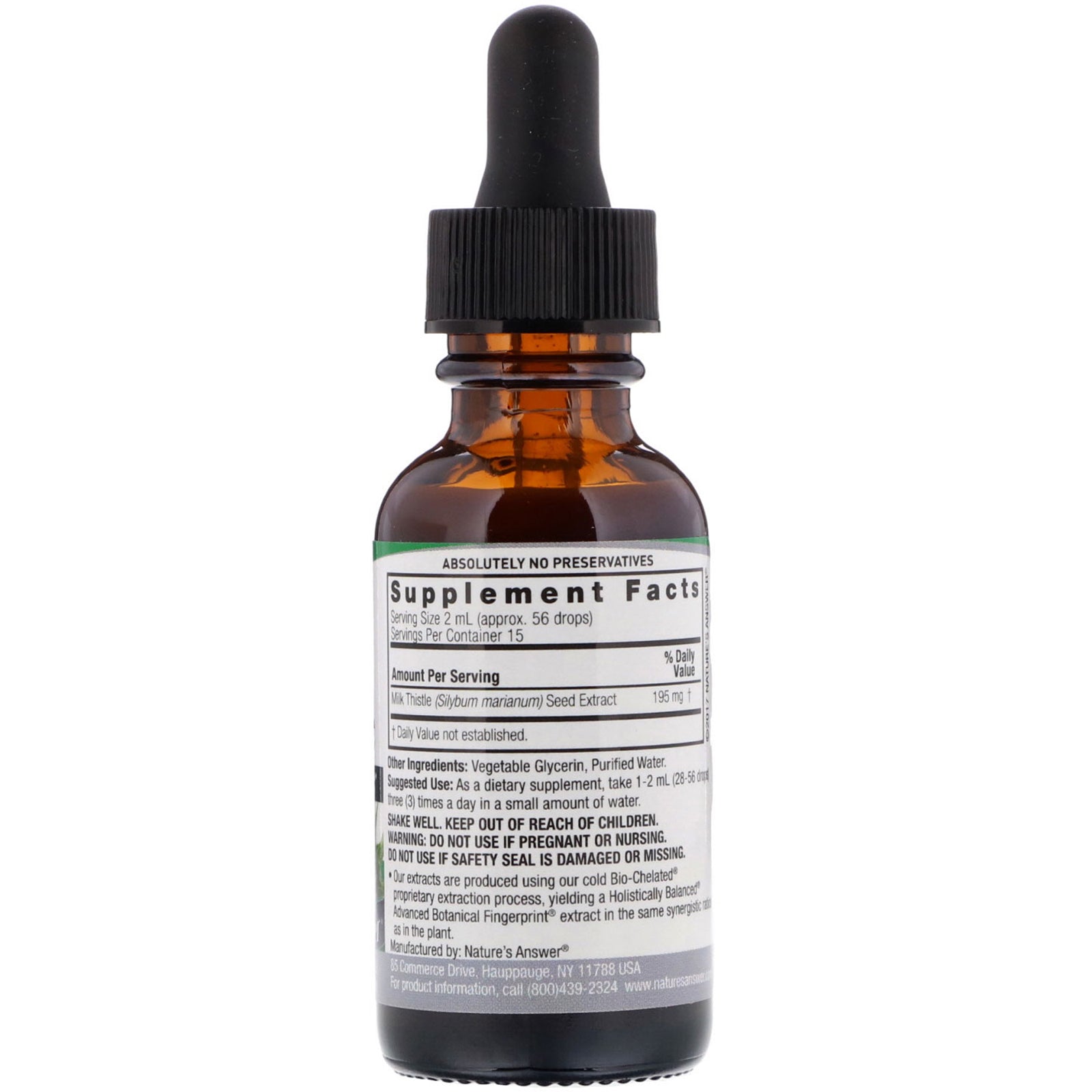 Since 1972 Promotes Healthy Liver Function Silybum Marianum Made From 2,000 mg Milk Thistle Seeds Per Serving Discover Nature's Answer Gluten-Free Non GMO Project Verified Herbal Supplement Absolutely No Preservatives K-Parve Bio-Chelated Cold Extraction Process Our extracts are produced using our cold Bio-Chelated proprietary extraction process, yielding a Holistically Balanced Advanced Botanical Fingerprint extract in the same synergistic ratios as in the plant.Sugg. UseAs a dietary supplement, take 1-2 mL (28-56 drops) three (3) times a day in a small amount of water.Other IngredientsVegetable glycerin, purified water.Supplement FactsServing Size: 2 mL (approx. 56 drops) Servings Per Container: 15 Amount Per Serving %Daily Value Milk Thistle (Silybum marianum) Seed Extract 195 mg † †Daily Value not establishedDisclaimerWhile VitaminsUK strives to ensure the accuracy of its product images and information, some manufacturing changes to packaging and/or ingredients may be pending update on our site. Although items may occasionally ship with alternate packaging,...