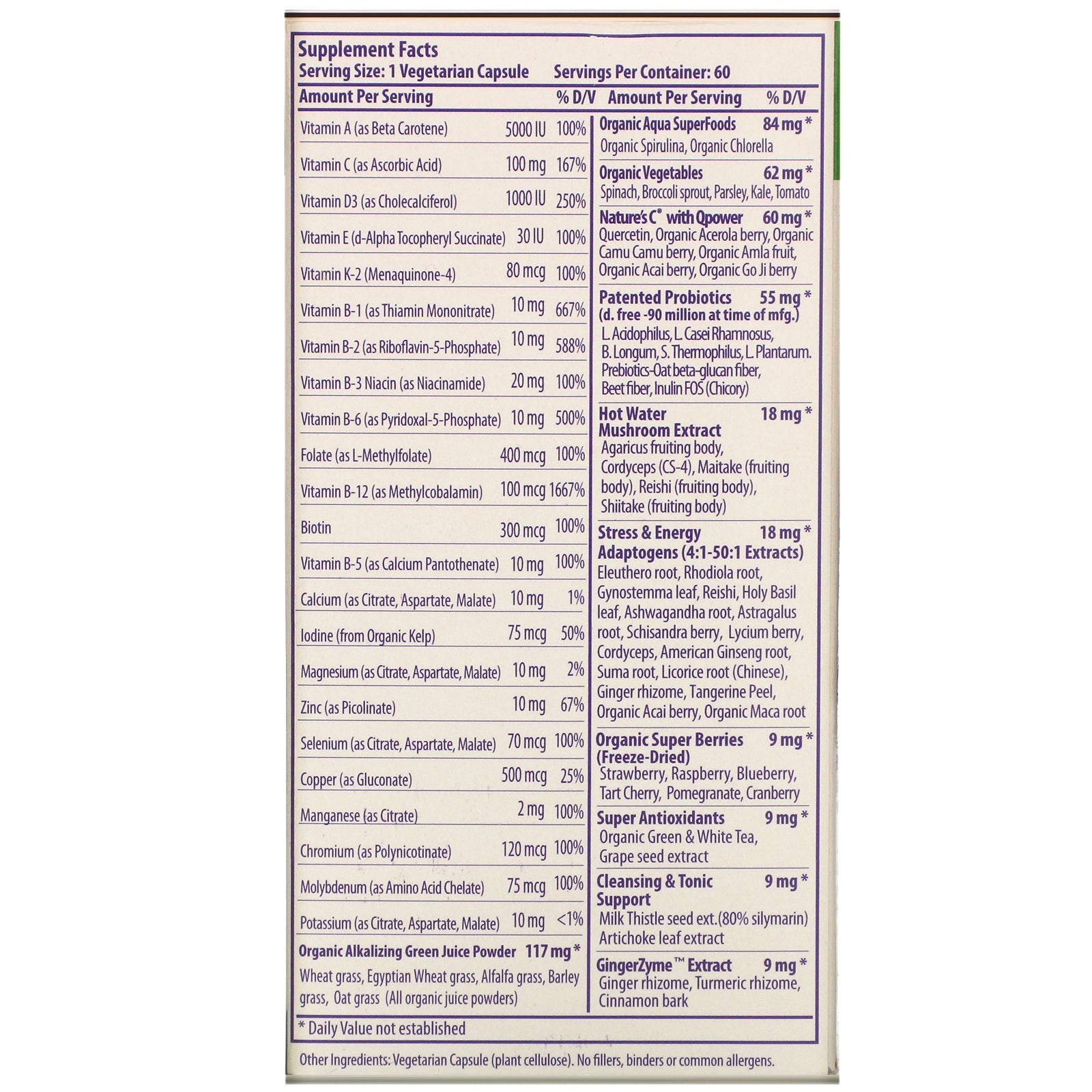 Serving Size: 1 Vegetarian Capsule Serving Per Container: 60 Amount Per Serving % Daily Value Vitamin A (as Beta Carotene) 5000 IU 100% Vitamin C (as Ascorbic Acid) 100 mg 167% Vitamin D3 (as Cholecalciferol) 1000 IU 250% Vitamin E (d-Alpha Tocopheryl Succinate) 30 IU 100% Vitamin K-2 (Menaquinone-4) 80 mcg 100% Vitamin B-1 (as Thiamin Mononitrate) 10 mg 667% Vitamin B-2 (as Riboflavin 5-Phosphate) 10 mg 588% Vitamin B-3 Niacin (as Niacinamide) 20 mg 100% Vitamin B-6 (as Pyridoxal-5-Phosphate) 10 mg 500% Folate (as L-Methylfolate) 400 mcg 100% Vitamin B-12 (as Methylcobalamin) 100 mcg 1667% Biotin 300 mcg 100% Vitamin B-5 (as Calcium Pantothenate) 10 mg 100% Calcium (as Citrate, Aspartate, Malate) 10 mg 1% Iodine (from Organic Kelp) 75 mcg 50% Magnesium (as Citrate, Aspartate, Malate) 10 mg 2% Zinc (as Picolinate) 10 mg 67% Selenium (as Citrate, Aspartate, Malate) 70 mcg 100% Copper (as Gluconate) 500 mcg 25% Manganese (as Citrate) 2 mg 100% Chromium (as Polynicotinate) 120 mcg 100% Molybdenum (as Amino Acid Chelate) 75 mcg 100% Potassium (as Citrate, Aspartate, Malate) 10 mg < 1% Organic Alkalizing Green Juice Powder s Wheat grass, Egyptian Wheat grass, Alfalfa grass, Barley grass, Oat grass (All organic juice powders) 117 mg * Organic Aqua SuperFoods Organic Spirulina, Organic Chlorella 84 mg * Organic Vegetables Spinach, Broccoli sprout, Parsley, Kale, Tomato 62 mg * Nature's C® with Qpower Quercetin, Organic Acerola berry, Organic Camu Camu berry, Organic Amla fruit, Organic Acai berry, Organic Go Ji berry 60 mg * Patented Probiotics (d. free-90 million at time of mfg.) L. Acidophilus, L. Casei Rhamnosus, B. Longum, S. Thermophilus, L. Plantarum. Prebiotics-Oat beta-glucan fiber, Beet fiber, inulin FOS (Chicory) 55 mg * Hot Water Mushroom Extract s Agaricus fruiting body, Cordyceps (CS-4), Maitake (fruiting body), Reishi (fruiting body), Shiitake (fruiting body) 18 mg * Stress & Energy Adaptogens (4:1-50:1 Extracts) Eleuthero root, Rhodiola root, Gynostemma leaf, Reishi, Holy Basil leaf, Ashwagandha root, Astragalus root, Schisandra berry, Lycium berry, Cordyceps, American Ginseng root, Suma root, Licorice root (Chinese), Ginger rhizome, Tangerine Peel, Organic Acai berry, Organic Maca root 18 mg * Organic Berry Blend (Freeze-Dried) Strawberry, Raspberry, Blueberry, Tart Cherry, Pomegranate, Cranberry 9 mg * Super Antioxidants Organic Green & White Tea, Grape seed extract 9 mg * Cleansing & Tonic Support Milk Thistle seed ext. (80% silymarin) Artichoke leaf extract 9 mg * GingerZyme™ Extract Ginger rhizome, Turmeric rhizome, Cinnamon bark 9 mg * * Daily Value not established.Disclaimer