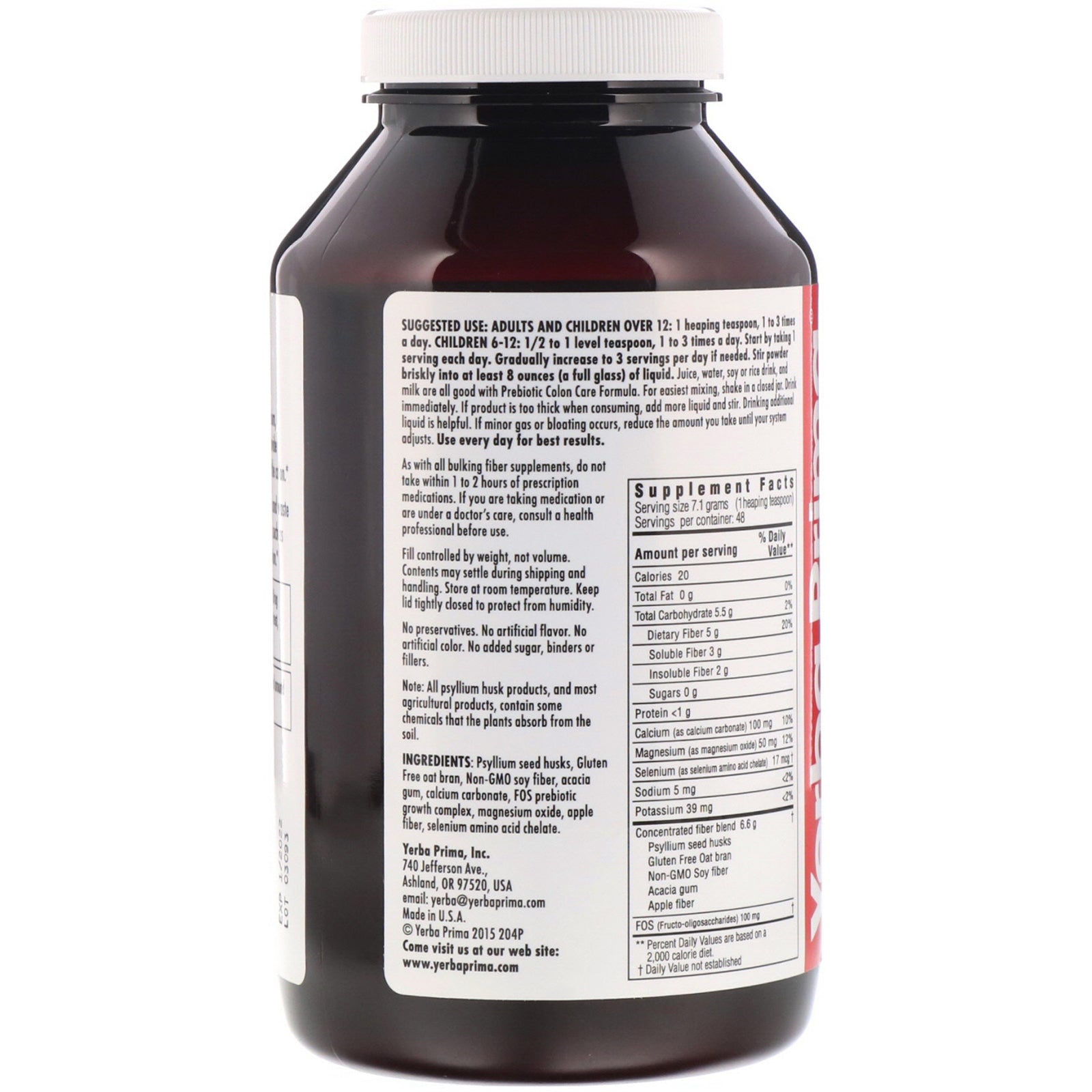 Psyllium seed husks, gluten free oat bran, non-gmo soy fiber, acacia gum, calcium carbonate, FOS prebiotic growth complex, magnesium oxide, apple fiber, selenium amino acid chelate. No preservatives. No artificial flavor. No artificial color. No added sugar, binders or fillers.Supplement Facts