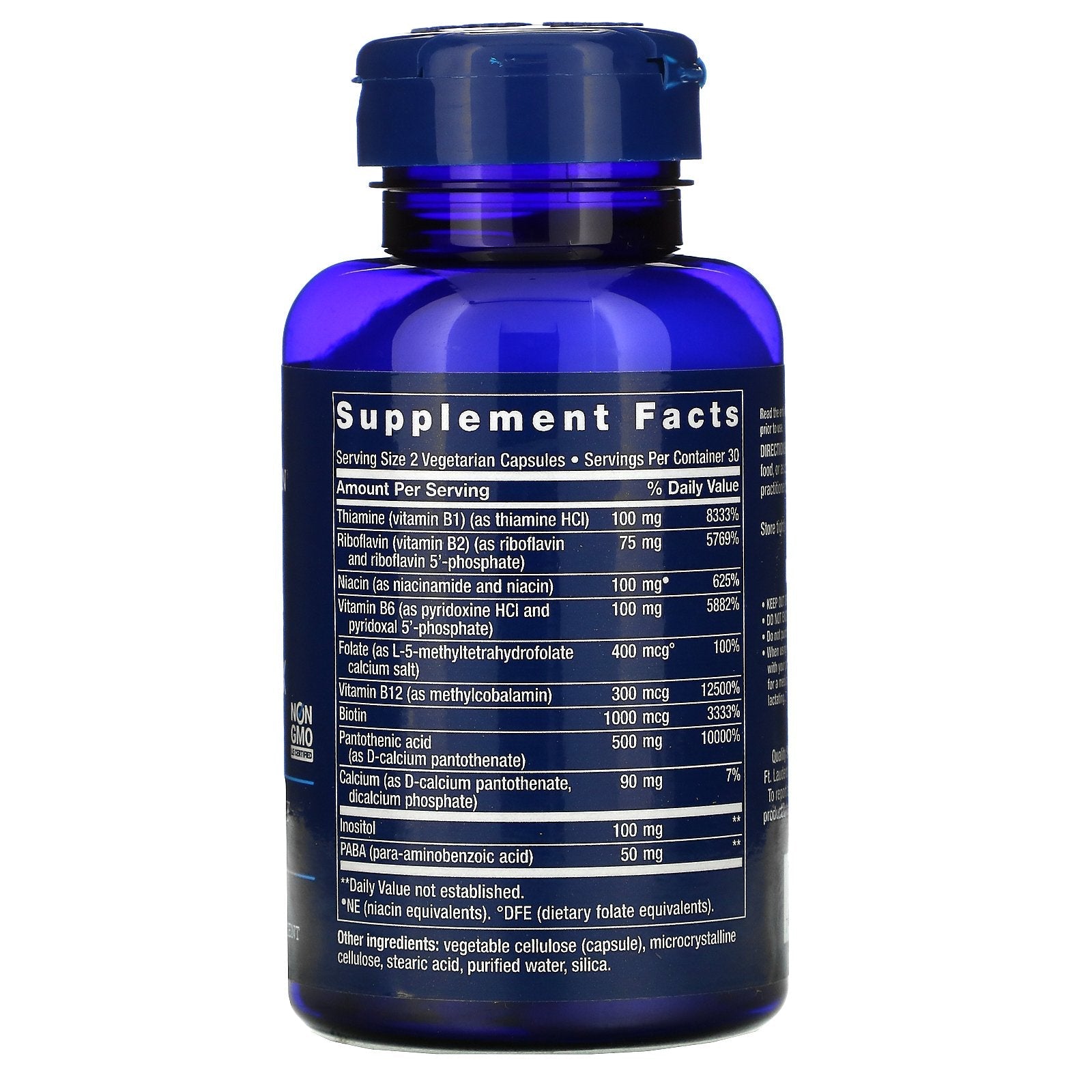 Serving Size: 2 Vegetarian Capsules Servings Per Container: 30 Amount Per Serving: % Daily Value Thiamine (vitamin B1) (as thiamine HCI) 100 mg 8333% Riboflavin (vitamin B2) (as riboflavin and riboflavin 5'-phosphate) 75 mg 5769% Niacin (as niacinamide and niacin) 100 mg• 625% Vitamin B6 (as pyridoxine HCI and pyridoxal 5' phosphate) 100 mg 5882% Folate (as L-5-methyltetrahydrofolate calcium salt) 400 mcg○ 100% Vitamin B12 (as methylcobalamin) 300 mcg 12500% Biotin 1000 mcg 3333% Pantothenic acid (as D-calcium pantothenate) 500 mg 10000% Calcium (as D-calcium pantothenate, dicalcium phosphate) 90 mg 7% Inositol 100 mg ** PABA (para-aminobenzoic acid) 50 mg ** **Daily Value not established. •NE (niacin equivalents) ○DFE (dietary folate equivalents)Disclaimer