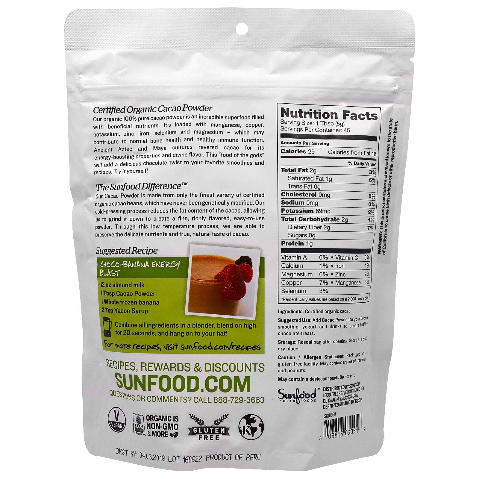 Energy-Boosting Superfood Non-GMO Vegan Gluten-Free Kosher USDA Non GMO Project Verified is Non-GMO & More Certified by CCOF Certified Cacao Powder Our 100% pure cacao powder is an incredible superfood filled with beneficial nutrients. It's loaded with manganese, copper, potassium, zinc, iron, selenium and magnesium - which may contribute to normal bone health and healthy immune function. Ancient Aztec and Maya cultures revered cacao for its energy-boosting properties and divine flavor. This "food of the gods" will add a delicious chocolate twist to your favorite smoothies and recipes. Try it yourself! The Sunfood Difference Our Cacao Powder is made from only the finest variety of certified heirloom cacao beans, which have never been hybridized or genetically modified. Our cold-pressing process reduces fat content of the cacao, allowing us to grind it down to create a fine, richly flavored, easy-to-use powder. Through this low temperature process, we are able to preserve the delicate nutrients and true, natural taste of cacao.