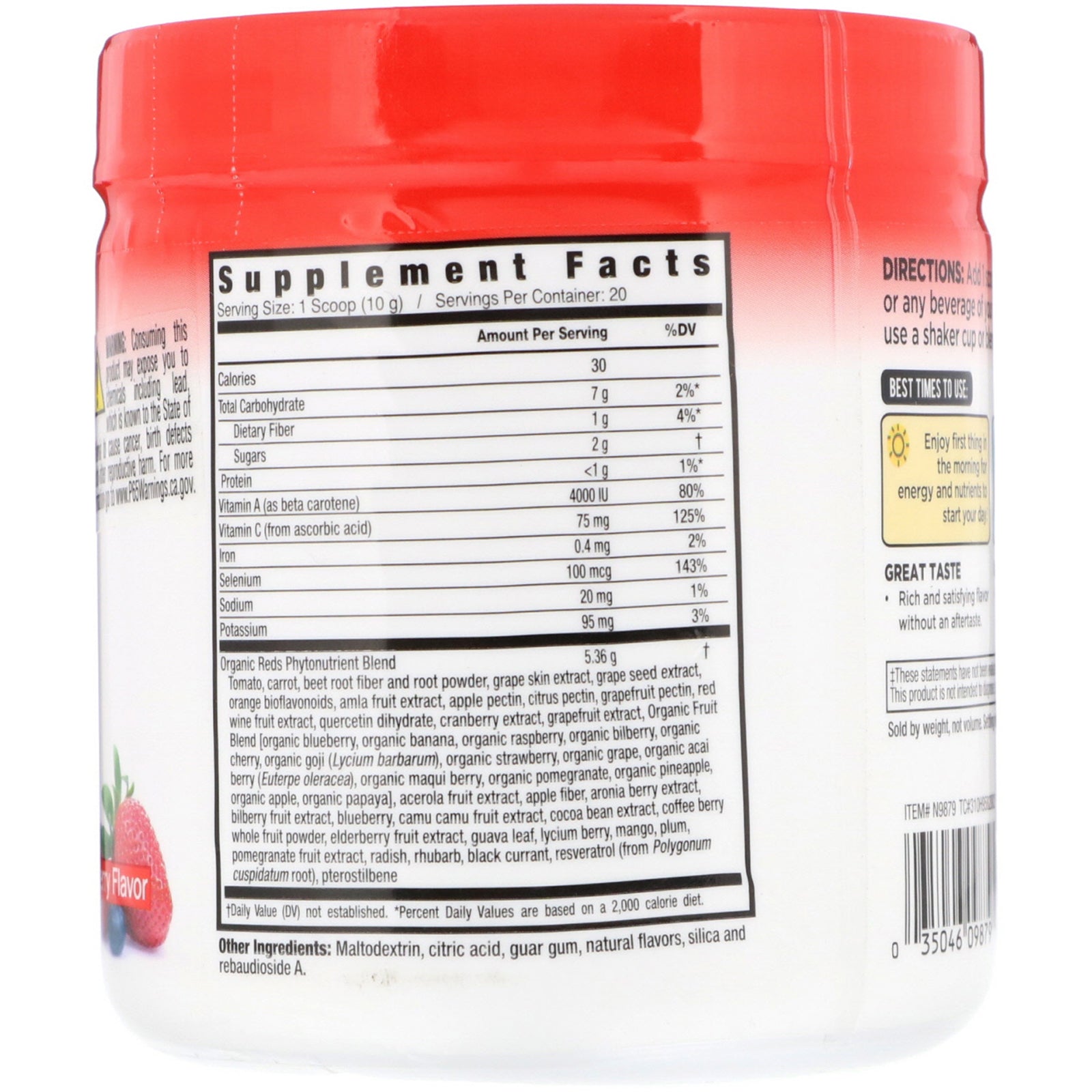 Serving Size: 1 Scoop (10 g) Servings Per Container: 20 Amount Per Serving %DV Calories 30 Total Carbohydrate 7 g 2%* Dietary Fiber 1 g 4%* Sugars 2 g † Protein < 1 g 1%* Vitamin A (as beta carotene) 4000 IU 80% Vitamin C (from ascorbic acid) 75 mg 125% Iron 0.4 mg 2% Selenium 100 mcg 143% Sodium 20 mg 1% Potassium 95 mg 3% Organic Reds Phytonutrient Blend Tomato, carrot, beet root fiber and root powder, grape skin extract, grape seed extract, orange bioflavonoids, amla fruit extract, apple pectin, citrus pectin, grapefruit pectin, red wine fruit extract, quercetin dihydrate, cranberry extract, grapefruit extract, Organic Fruit Blend [organic blueberry, organic banana, organic raspberry, organic bilberry, organic cherry, organic goji (Lycium barbarum), organic strawberry, organic grape, organic acai berry (Euterpe oleracea), organic maqui berry, organic pomegranate, organic pineapple, organic apple, organic papaya], acerola fruit extract, apple fiber, aronia berry extract, bilberry fruit extract, blueberry, camu camu fruit extract, cocoa bean extract, coffee berry whole fruit powder, elderberry fruit extract, guava leaf, lycium berry, mango, plum, pomegranate fruit extract, radish, rhubarb, black currant, resveratrol (from Polygonum cuspidatum root), pterostilbene. 5.36 g † †Daily Value (DV) not established. *Percent Daily Values are based on a 2,000 calorie diet.Disclaimer