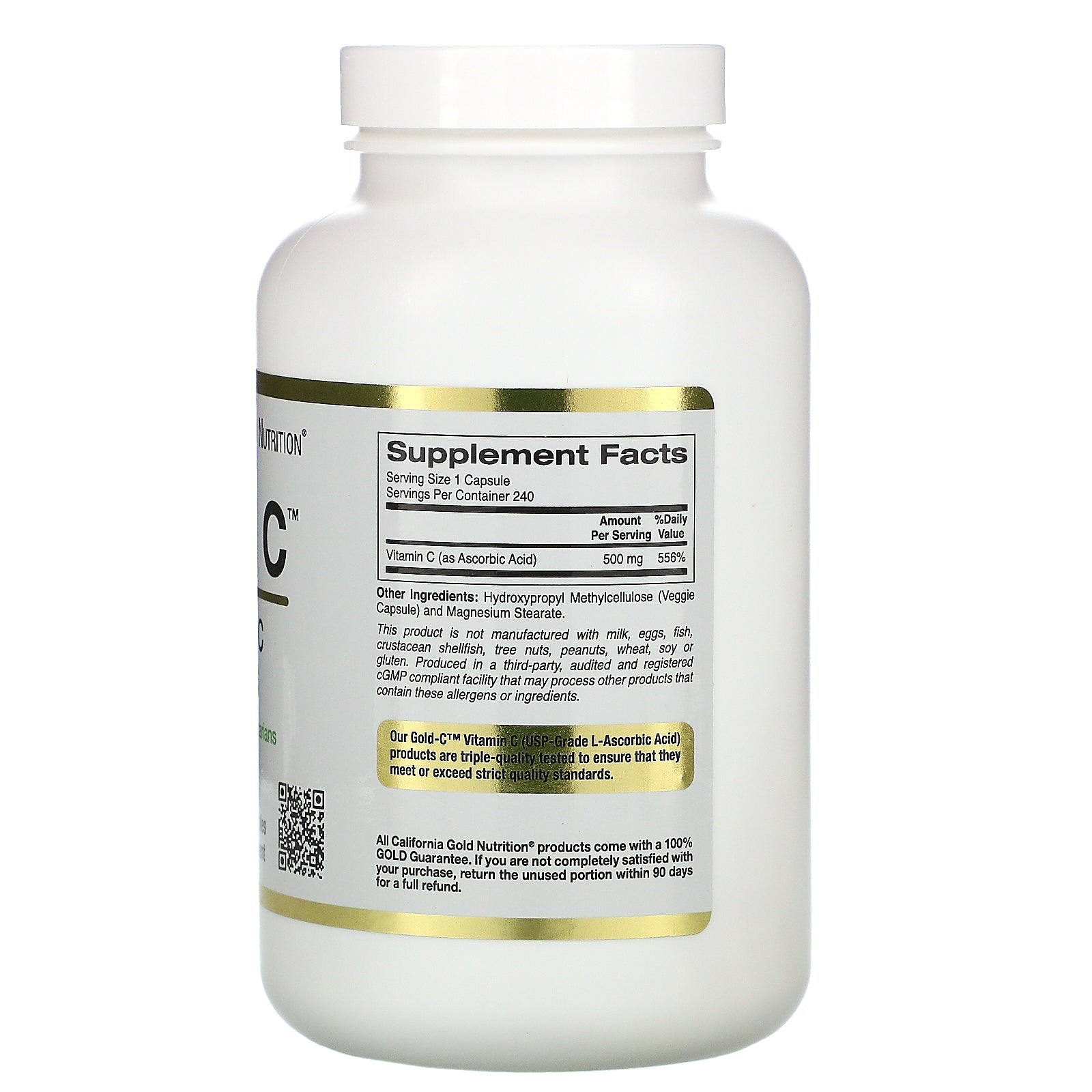 California Gold Nutrition Gold C™, 500 mg Featuring USP Grade Vitamin C Suitable for Vegans & Vegetarians Formulated to Contain: No Gluten, No GMOs, No Soy Produced in a 3rd Party Audited cGMP Registered (Certified) Facility 100% Gold Guarantee California Gold Nutrition Gold C ™ Vitamin C is USP Grade L-Ascorbic Acid and is triple quality tested to ensure that it meets or exceeds strict quality standards. iHerb Blog: 10 Health Benefits of Vitamin C Buffered vs Unbuffered Vitamin C: What Are the Benefits? iTested VerifiedSugg. UseTake 1 capsule daily, with or without food. Best when taken as directed by a qualified healthcare professional.Other IngredientsMain Ingredients Vitamin C (as Ascorbic Acid) Other Ingredients Hydroxypropyl Methylcellulose (Veggie Capsule) and Magnesium Stearate. Aroma, color, consistency, and taste may vary. Color shift is normal and cannot be avoided. This product is not manufactured with milk, eggs, fish, crustacean shellfish, tree nuts, peanuts, wheat,...