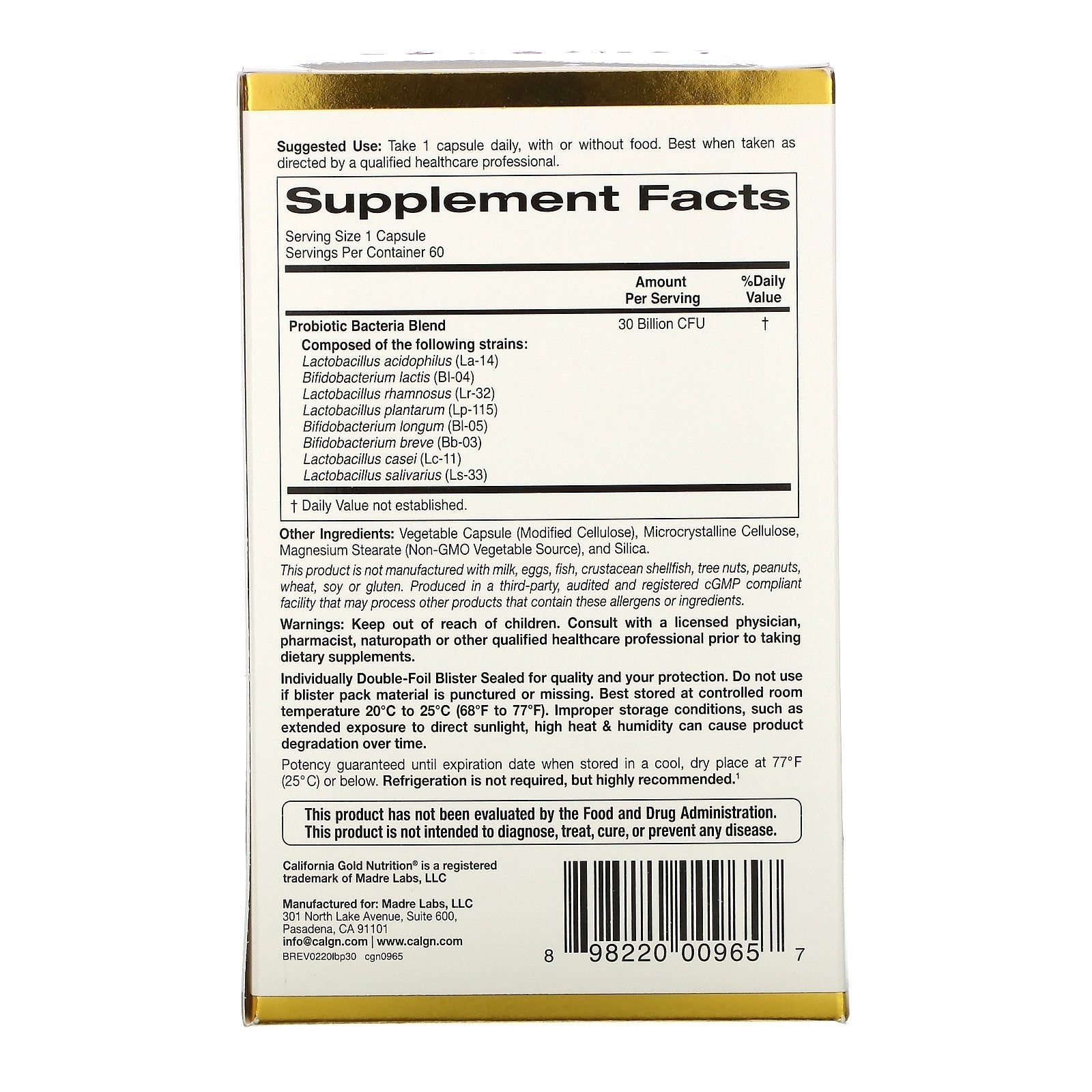 Serving Size: 1 Capsule Servings Per Container: 60 Amount Per Serving % Daily Value Probiotic Bacteria Blend 30 Billion CFU † Composed of the following strains: Lactobacillus acidophilus (La-14) Bifidobacterium lactis (BI-04) Lactobacillus rhamnosus (Lr-32) Lactobacillus plantarum (Lp-115) Bifidobacterium longum (BI-05) Bifidobacterium breve (Bb-03) Lactobacillus casei (Lc-11) Lactobacillus salivarius (Ls-33) † Daily Value not established.Disclaimer