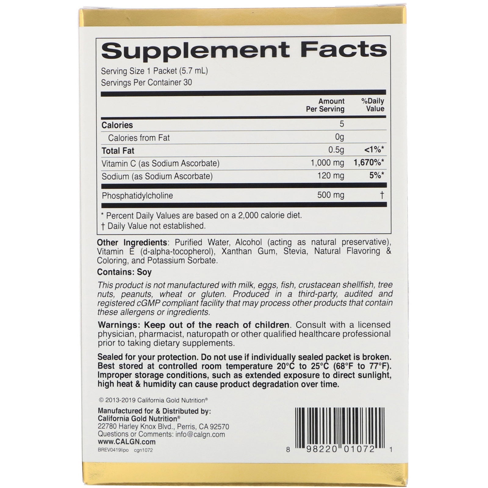 Main Ingredients Vitamin C (as Sodium Ascorbate), Phosphatidylcholine Other Ingredients Purified Water, Alcohol (acting as natural preservative), Vitamin E (d-alpha-tocopherol), Xanthan Gum, Stevia, Natural Flavoring & Coloring, and Potassium Sorbate. Contains: Soy This product is not manufactured with milk, eggs, fish, crustacean shellfish, tree nuts, peanuts, wheat, soy or gluten. Produced in a third-party, audited and registered cGMP compliant facility that may process other products that contain these allergens or ingredientsSupplement Facts