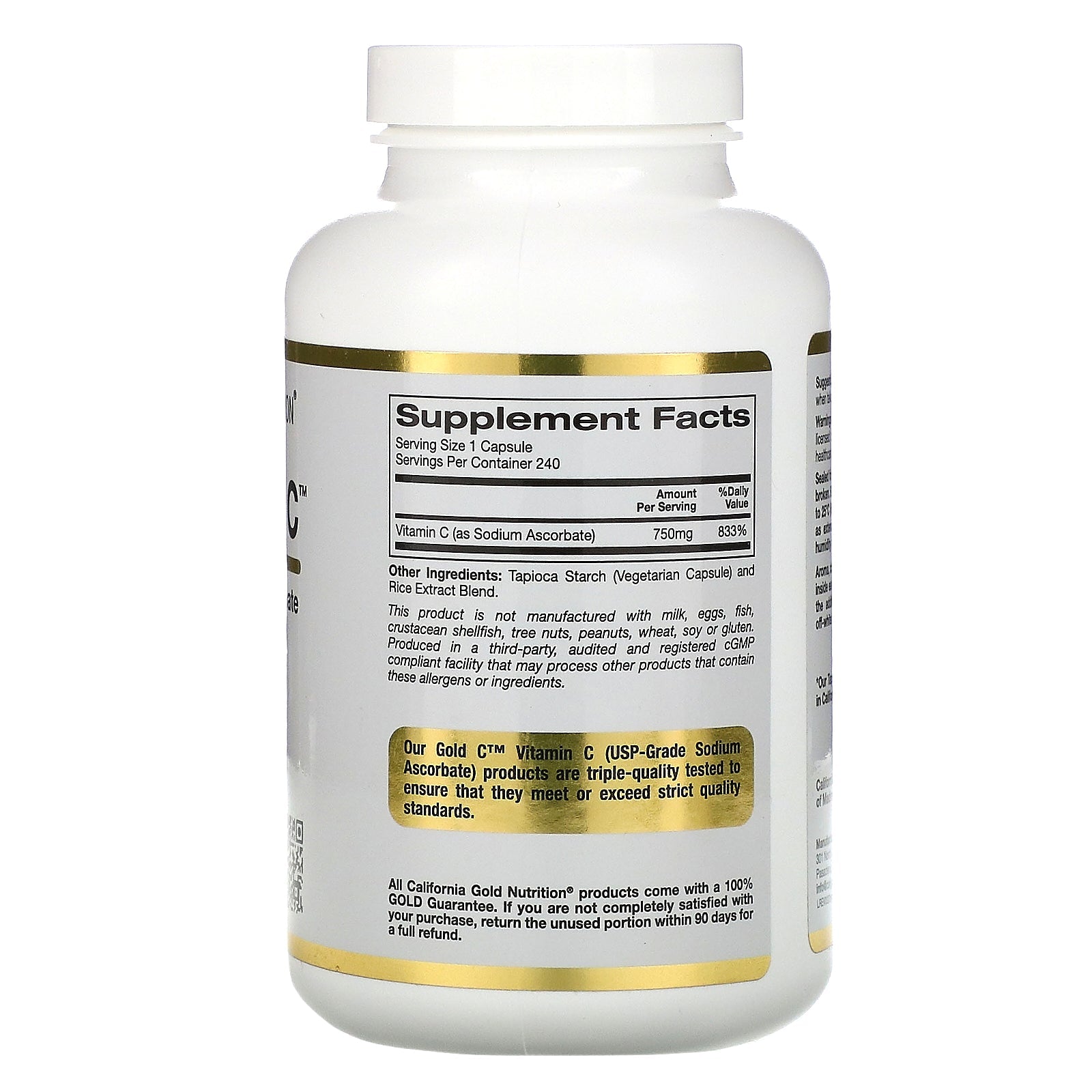 Serving Size: 1 Capsule Servings Per Container: 240 Amount Per Serving %Daily Value Vitamin C (as sodium ascorbate) 750 mg 833%Disclaimer