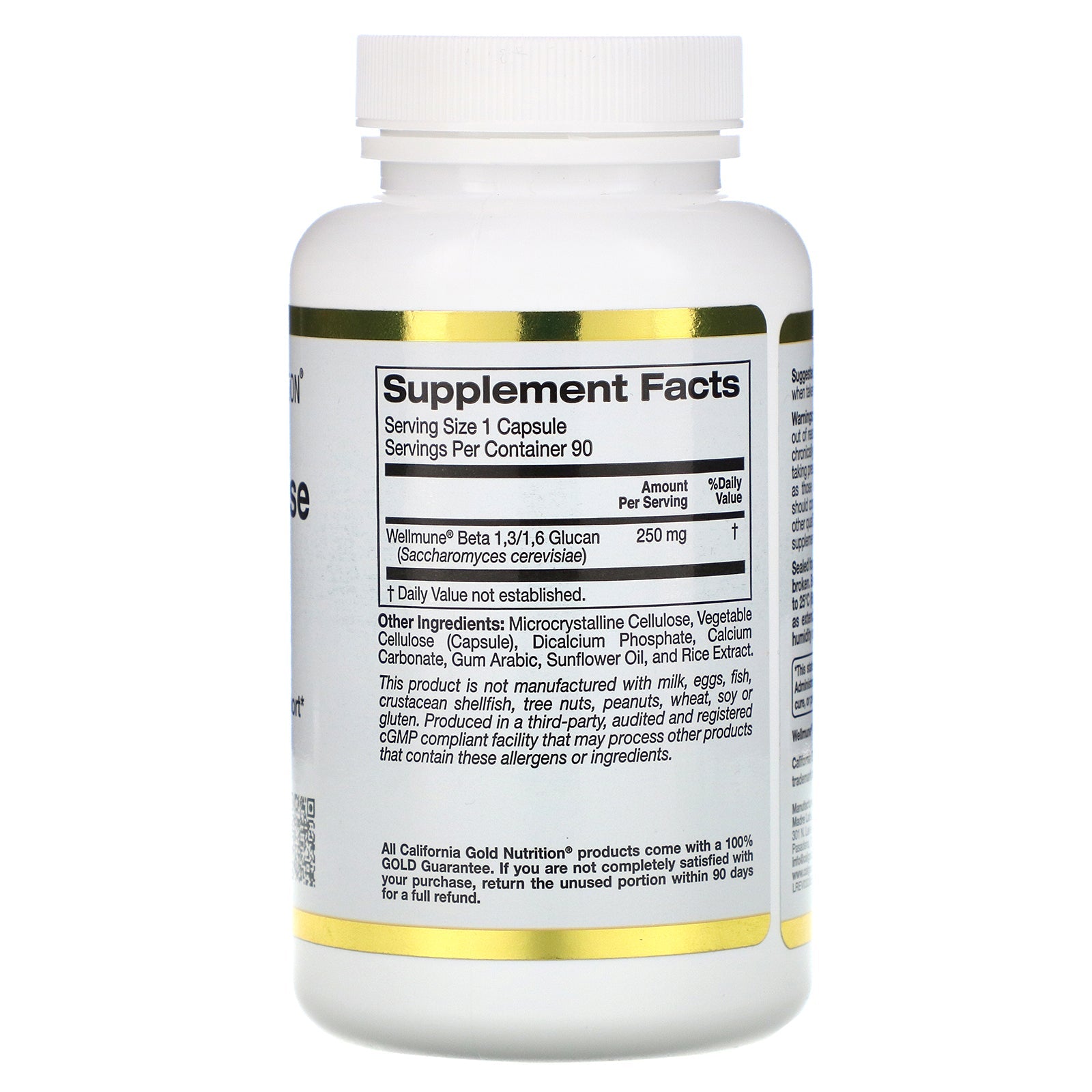 Main Ingredients Wellmune® Beta 1,3/1,6 Glucan (Saccharomyces cerevisiae) Wellmune® is a registered trademark of Kerry Group. Other Ingredients Microcrystalline Cellulose, Vegetable Cellulose (Capsule), Dicalcium Phosphate, Calcium Carbonate, Gum Arabic, Sunflower Oil, and Rice Extract. This product is not manufactured with milk, eggs, fish, crustacean shellfish, tree nuts, peanuts, wheat, soy, or gluten. Produced in a third-party, audited and registered cGMP compliant facility that may process other products that contain these allergens or ingredients.Supplement Facts