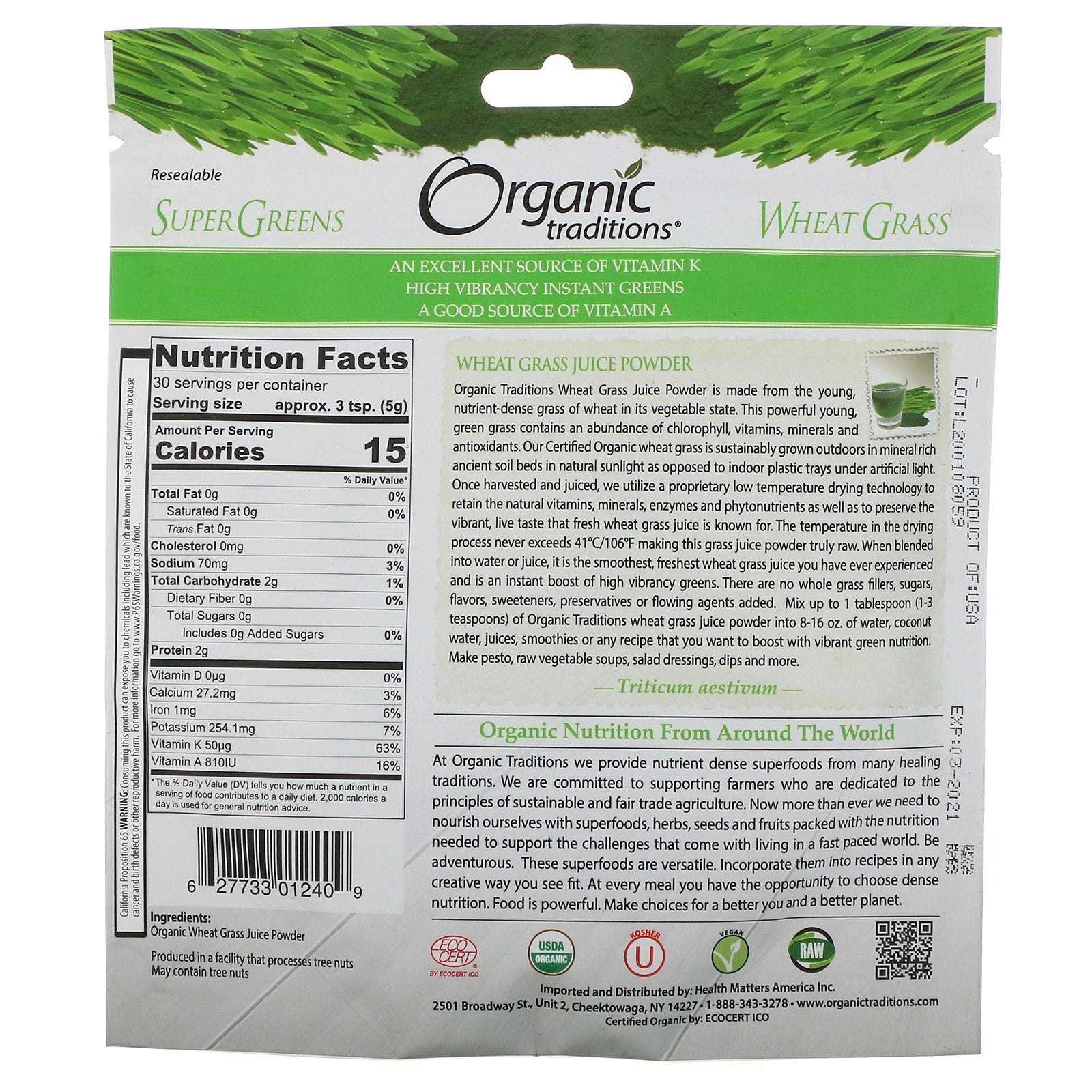 100% Juiced For Optimal Digestion and Assimilation No Whole Dried Grass Premium Superfoods Conscious Sourcing Outdoor Grown in Natural Sunlight Dissolves Easily Delicious Smooth Taste An Excellent Source of Vitamin K High Vibrancy Instant Greens A Good Source of Vitamin A Enhance Your Smoothies With This Incredible Superfood Low Temperature Dried Dissolves Instantly in Any Drink or Recipe Eat Well - Live Well Food is Powerful Vibrant Living USDA Kosher Vegan Raw Resealable Triticum Aestivum Wheat Grass Juice Powder Traditions Wheat Grass Juice Powder is made from the young, nutrient-dense grass of wheat in its vegetable state. This powerful young, green grass contains an abundance of chlorophyll, vitamins, minerals and antioxidants. Our Certified wheat grass is sustainably grown outdoors in mineral rich ancient soil beds in natural sunlight as opposed to indoor plastic trays under artificial light. Once harvested and juiced, we utilize a proprietary low temperature drying technology to retain natural vitamins, minerals, enzymes and phytonutrients as well as to preserve the vibrant, live taste that fresh wheat grass juice is known for. The temperature in the dying process never exceeds 41°C/106°F making this grass juice powder truly raw. When blended into water or juice, it is the smoothest, freshest wheat grass juice you have ever experienced and is an instant boost of high vibrancy greens. There are no whole grass fillers, sugars, flavors, sweeteners, preservatives or flowing agents added. Nutrition From Around The World At Traditions we provide nutrient dense superfoods from many healing traditions. We are committed to supporting farmers who are dedicated to the principles of sustainable and fair trade agriculture. Now more than ever we need to nourish ourselves with superfoods, herbs, seeds and fruits packed with the nutrition needed to support the challenges that come with living in a fast paced world. Be adventurous. These superfoods are versatile. Incorporate them into recipes in any creative way you see fit. At every meal you have the opportunity to choose dense nutrition. Food is powerful. Make choices for a better you and a better planet.