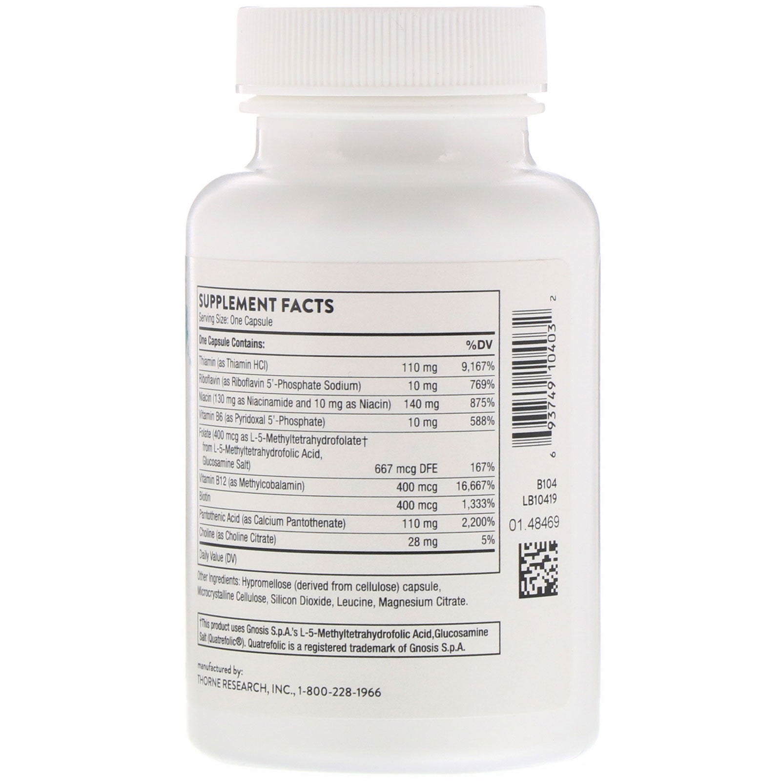 Dietary Supplement Stress Foundational Energy Gluten Free Basic B Complex contains active forms of the vitamins for enhanced availability to the tissues. B vitamins are essential for healthy neurological function and energy production.Sugg. UseTake 1 capsule one to three times daily or as recommended by your health-care practitioner.Other IngredientsHypromellose (derived from cellulose) capsule, microcrystalline cellulose, silicon dioxide, leucine, magnesium citrate.Supplement FactsServing Size: One Capsule One Capsule Contains: % DV Thiamin (as Thiamin HCl) 110 mg 9,167% Riboflavin (as Riboflavin 5'-Phosphate Sodium) 10 mg 769% Niacin (130 mg as Niacinamide and 10 mg as Niacin) 140 mg 875% Vitamin B6 (as Pyridoxal 5'-Phosphate) 10 mg 588% Folate (400 mcg as L-5-Methyltetrahydrofolate † from L-5-Methyltetrahydrofolic Acid, Glucosamine Salt) 667 mcg DFE 167% Vitamin B12 (as Methylcobalamin) 400 mcg 16,667% Biotin 400 mcg 1,333% Pantothenic Acid (as Calcium Pantothenate) 110 mg 2,200% Choline (as Choline Citrate) 28 mg 5% Daily Value (DV) †This...
