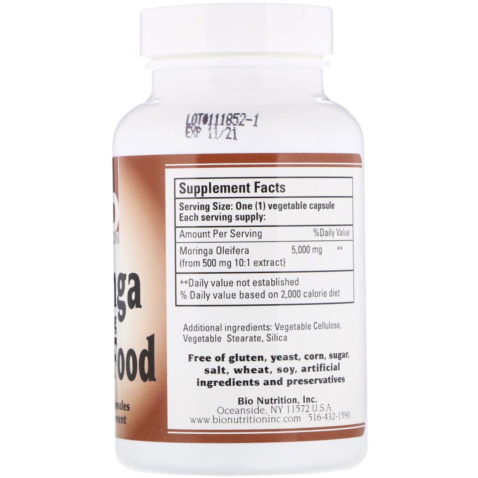 Energy Mental Alertness Digestion Immune Function Weight Loss Heart Health Skin & So Much More Dietary Supplement Vegetarian Halal Food Council Moringa is known as the miracle plant. Bio Nutrition uses the finest Moringa 10:1 extract derived from selected hand picked leaves. This nutrient dense food contains vitamins A,B,C & the minerals iron & potassium as well as essential amino acids, co-enzymes and antioxidants. Moringa 5,000 can be a healthy addition to anyone's diet and may contribute to overall health.Sugg. UseTake (1) capsule twice daily before a meal with water or as recommended by a health care professional.Other IngredientsVegetable cellulose, vegetable stearate, silica Free of gluten, yeast, corn, sugar, salt, wheat, soy, artificial ingredients and preservatives.Supplement FactsServing Size: One (1) vegetarian capsules Each serving supplies: Amount Per Serving %Daily Value Moringa Oleifera (from 500 mg 10:1 extract) 5,000 mg ** **Daily value not established % Daily value based on 2,000...