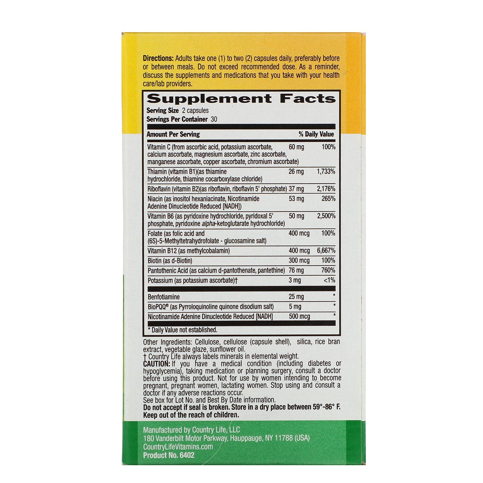 Serving Size: 2 capsules Servings Per Container: 30 Amount Per Serving % Daily Value Vitamin C (from ascorbic acid, potassium ascorbate, calcium ascorbate, magnesium ascorbate, zinc ascorbate, manganese ascorbate, copper ascorbate, chromium ascorbate) 60 mg 100% Thiamin (vitamin B1) (as thiamine hydrochloride, thiamine cocarboxylase chloride) 26 mg 1,733% Riboflavin (vitamin B2) (as riboflavin, riboflavin 5' phosphate) 37 mg 2,176% Niacin (as inositol hexaniacinate, Nicotinamide Adenine Dinucleotide Reduced [NADH] 53 mg 265% Vitamin B6 (as pyridoxine hydrochloride, pyridoxal 5' phosphate, pyridoxine alpha-ketoglutarate hydrochloride) 50 mg 2,500% Folate (as folic acid and (6S)-5-Methyltetrahydrofolate, glucosamine salt) 400 mcg 100% Vitamin B12 (as methylcobalamin) 400 mcg 6,667% Biotin (as d-Biotin) 300 mcg 100% Pantothenic Acid (as calcium d-pantothenate, pantethine) 76 mg 760% Potassium (as potassium ascorbate)† 3 mg <1% Benfotiamine 25 mg * BioPQQ® (as Pyrroloquinoline quinone disodium salt) 5 mg * Nicotinamide Adenine Dinucleotide Reduced [NADH] 500 mcg * * Daily Value not established. † Country Life always labels minerals in elemental weight.Disclaimer