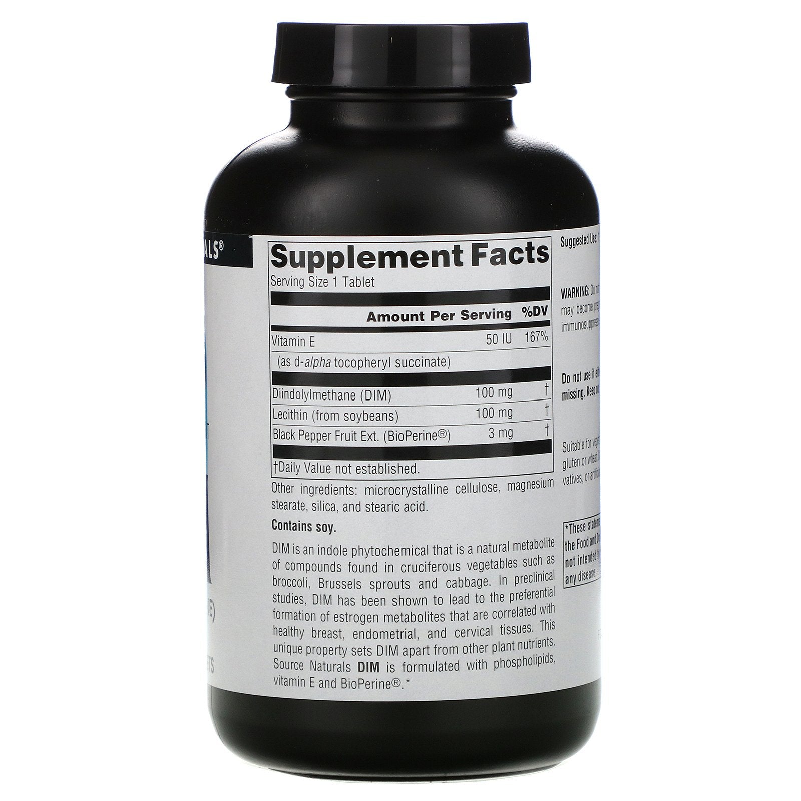 Dietary Supplement Suitable for Vegetarians DIM is an indole phytochemical that is a natural metabolite of compounds found in cruciferous vegetables such as broccoli, Brussels sprouts and cabbage. In preclinical studies, DIM has been shown to lead to the preferential formation of estrogen metabolites that are correlated with healthy breast, endometrial, and cervical tissues. This unique property sets DIM apart from other plant nutrients. Source Natural DIM is formulated with phospholipids, vitamin E and BioPerine ®.Sugg. Use1 tablet 1 to 4 times daily with meals.Other IngredientsMicrocrystalline cellulose, magnesium stearate, silica, and stearic acid. Contains soy. Contains no yeast, dairy, egg, gluten or wheat. Contains no sugar, starch, salt, preservatives, or artificial color, flavor or fragrance.Supplement FactsServing Size: 1 Tablet Amount Per Serving %DV Vitamin E (as d-alpha tocopheryl succinate) 50 IU 167% Diindolylmethane (DIM) 100 mg † Lecithin (from soybeans) 100 mg † Black Pepper Fruit Extract (BioPerine ® )...