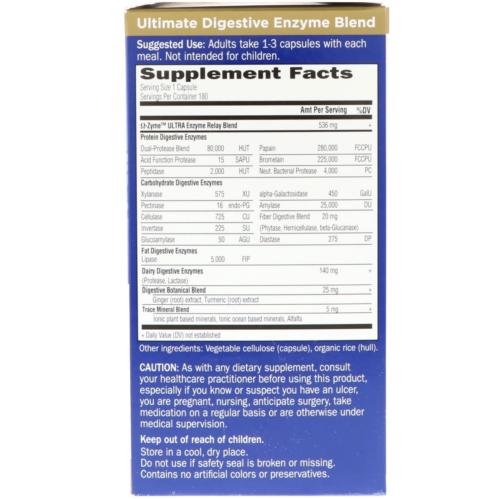 Serving Size: 1 Capsule Servings Per Container: 180 Amount Per Serving %DV Ω-Zyme Ultra Enzyme Relay Blend 536 mg + Protein Digestive Enzymes Dual-Protease Blend 80,000 HUT Acid Function Protease 15 SAPU Peptidase 2,000 HUT Papain 280,000 FCCPU Bromelain 225,000 FCCPU Neut. Bacterial Protease 4,000 PC Carbohydrate Digestive Enzymes Xylanase 575 XU Pectinase 16 endo-PG Cellulase 725 CU Invertase 225 SU Glucoamylase 50 AGU alpha-Galactosidase 450 GALU Amylase 25,000 DU Fiber Digestive Blend (Phytase, Hemicellulase, beta-Glucanase) 20 mg Diastase 275 DP Fat Digestive Enzymes Lipase 5,000 FIP Dairy Digestive Enzymes (Protease, Lactase) 53 mg + Digestive Botanical Blend Ginger (root) extract, Turmeric root extract 25 mg + Trace Mineral Blend Ionic plant based minerals, Ionic ocean based minerals, Alfalfa 5 mg + + Daily Value not established.Disclaimer