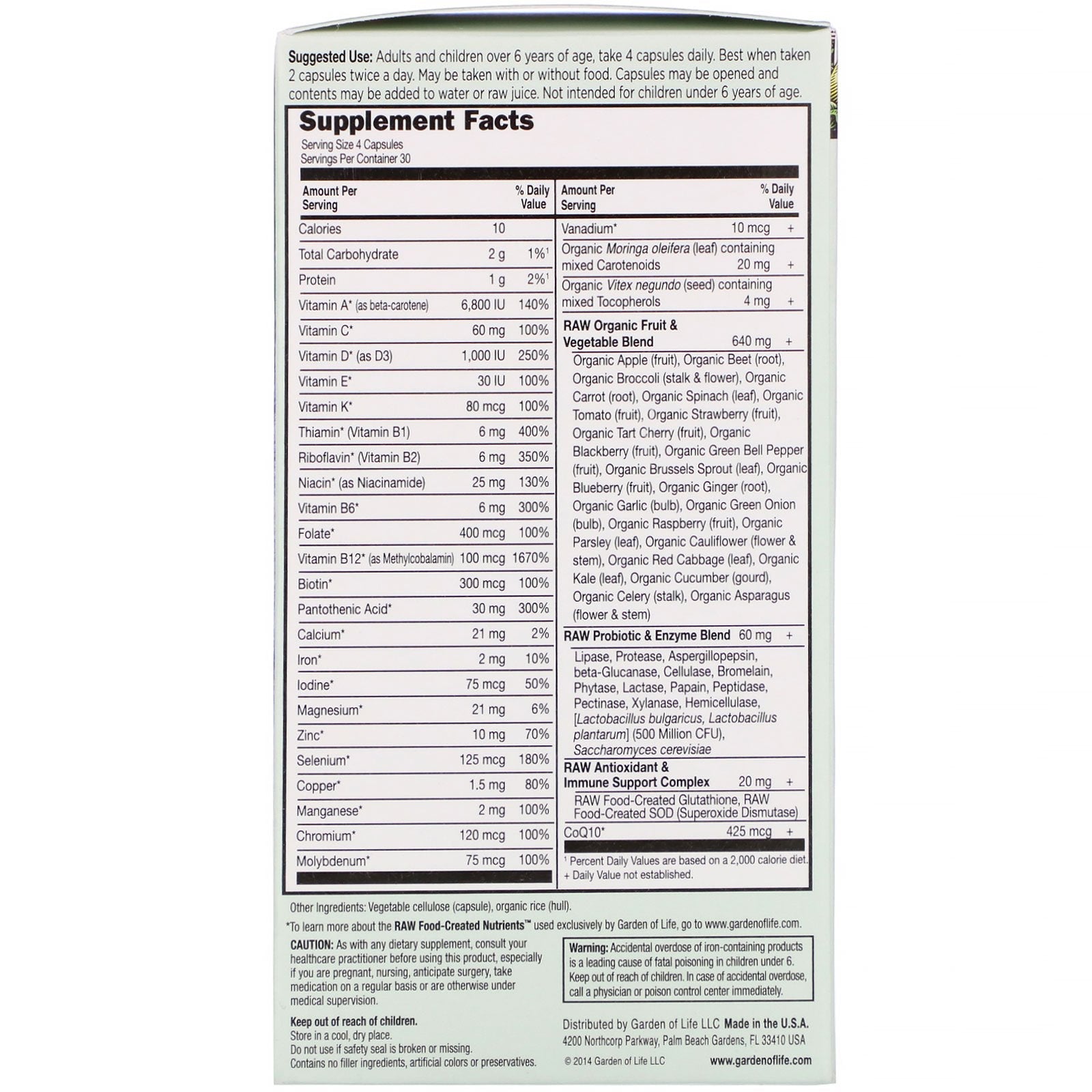 Serving Size: 4 Capsules Servings Per Container: 30 Amount Per Serving % Daily Value Calories 10 Total Carbohydrate 2 g 1%¹ Protein 1 g 2%¹ Vitamin A (as beta-carotene) 6,800 IU 140% Vitamin C 60 mg 100% Vitamin D (as D3) 1,000 IU 250% Vitamin E 30 IU 100% Vitamin K 80 mcg 100% Thiamin (Vitamin B1) 6 mg 400% Riboflavin (Vitamin B2) 6 mg 350% Niacin (as Niacinamide) 25 mg 130% Vitamin B6 6 mg 300% Folate 400 mcg 100% Vitamin B12 (as Methylcobalamin) 100 mcg 1670% Biotin 300 mcg 100% Pantothenic Acid 30 mg 300% Calcium 21 mg 2% Iron 2 mg 10% Iodine 75 mcg 50% Magnesium 21 mg 6% Zinc 10 mg 70% Selenium 125 mcg 180% Copper 1.5 mg 80% Manganese 2 mg 100% Chromium 120 mcg 100% Molybdenum 75 mcg 100% Vanadium 10 mcg + Organic Moringa oleifera (leaf) containing mixed Carotenoids 20 mg + Organic Vitex negundo (seed) containing mixed Tocopherols 4 mg + Raw Organic Fruit & Vegetable Blend Organic Apple (fruit), Organic Beet (root), Organic Broccoli (stalk & flower), Organic Carrot (root), Organic Spinach (leaf), Organic Tomato (fruit), Organic Strawberry (fruit), Organic Tart Cherry (fruit), Organic Blackberry (fruit), Organic Green Bell Pepper (fruit), Organic Brussels Sprout (leaf), Organic Blueberry (fruit), Organic Ginger (root), Organic Garlic (bulb), Organic Green Onion (bulb), Organic Raspberry (fruit), Organic Parsley (leaf), Organic Cauliflower (flower & stem), Organic Red Cabbage (leaf), Organic Kale (leaf), Organic Cucumber (gourd), Organic Celery (stalk), Organic Asparagus (flower & stem) 640 mg + Raw Probiotic & Enzyme Blend Lipase, Protease, Aspergillopepsin, beta-Glucanase, Cellulase, Bromelain, Phytase, Lactase, Papain, Peptidase, Pectinase, Xylanase, Hemicellulase, [Lactobacillus bulgaricus, Lactobacillus plantarum] (500 Million CFU), Saccharomyces cerevisiae 60 mg + Raw Antioxidant & Immune Support Complex Raw Food-Created Glutathione, RAW Food-Created SOD (Superoxide Dismutase) 20 mg + CoQ10 425 mcg + ¹ Percent Daily Values are based on a 2,000 calorie diet. + Daily Value not established.Disclaimer