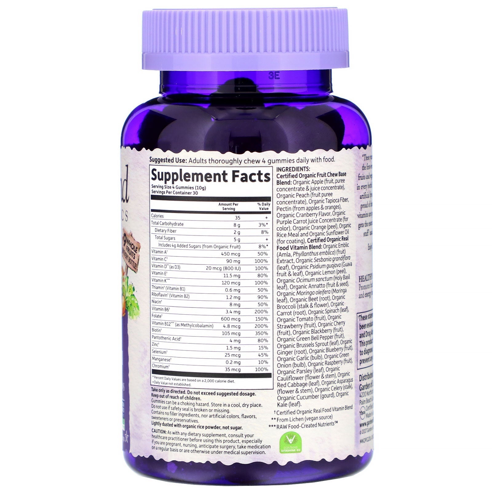 Serving Size : 4 gummies (10 g) Serving Per Container : 30 Amount Per Serving %Daily Value Calories 35 + Total Carbohydrate 8 g 3% Dietary Fiber 2 g 8% Total Sugars 5 g + Includes 4 g Added Sugars (from Fruit) 8%* Vitamin A† 450 mcg 50% Vitamin C† 90 mg 100% Vitamin D** (as D3) 20 mcg (800 IU) 100% Vitamin E† 11.5 mg 80% Vitamin K*** 120 mcg 100% Thiamin† (Vitamin B1) 0.6 mg 50% Riboflavin† (Vitamin B2) 1.2 mg 90% Niacin† 8 mg 50% Vitamin B6† 3.4 mg 200% Folate† 600 mcg 150% Vitamin B12*** (as Methylcobalamin) 4.8 mcg 200% Biotin† 105 mcg 350% Pantothenic Acid† 4 mg 80% Zinc† 1.5 mg 15% Selenium† 25 mcg 45% Manganese† 0.2 mg 10% Chromium† 35 mcg 100% *Percent Daily Values are based on a 2,000 calorie diet. +Daily Value not established. †Certified Real Food Vitamin Blend **From Lichen (vegan source) ***RAW Food-Created Nutrients™Disclaimer
