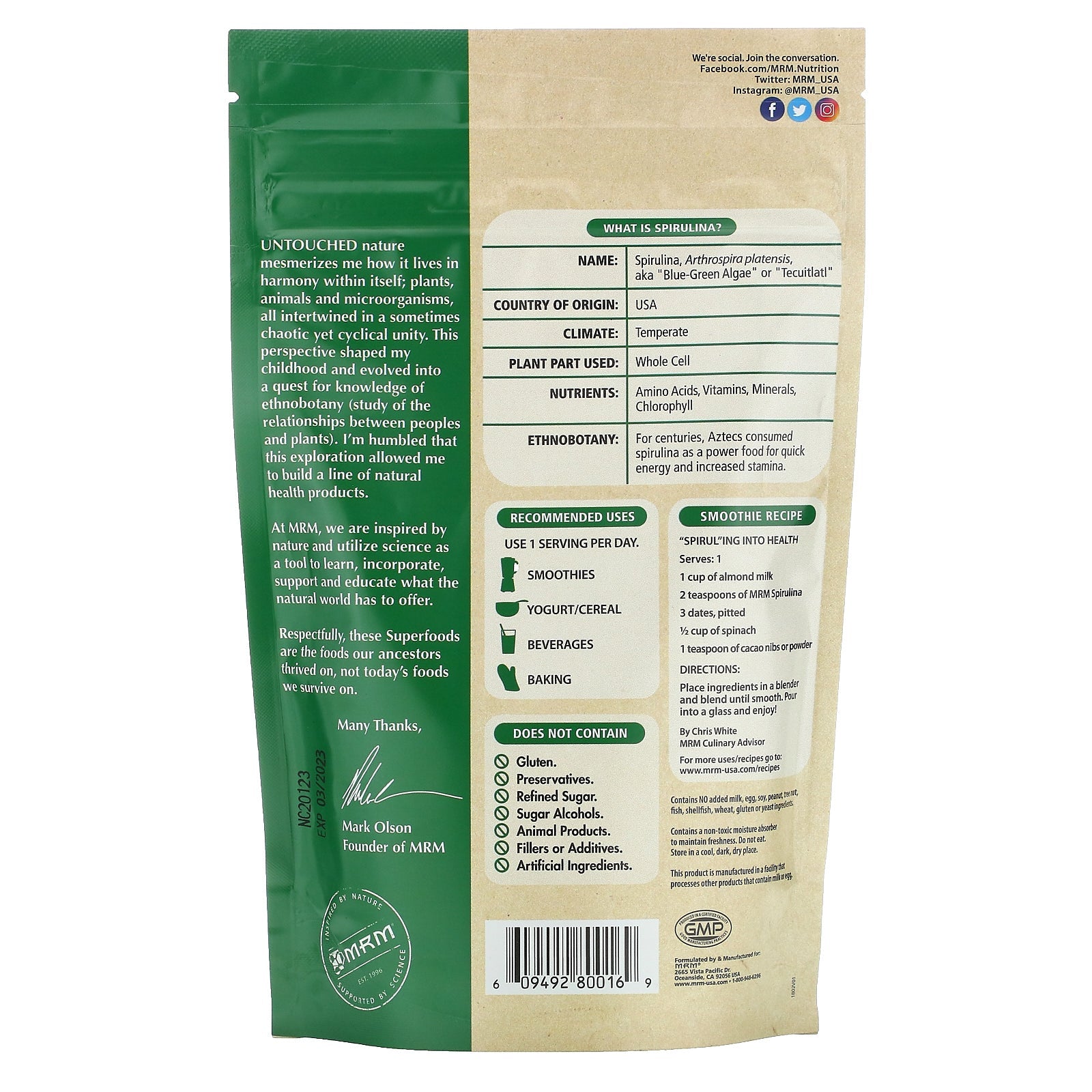 Eco Friendly Packaging Superfoods by MRM® Non GMO Project Verified Certified Vegan Gluten Free Amazing Micro-Algae Inspired by Nature Est. 1996 Supported by Science GMP - Produced in a Certified Facility - Good Manufacturing Practices Untouched nature mesmerizes me how it lives in harmony within itself; plants, animals and microorganisms, all intertwined in a sometimes chaotic yet cyclical unity. This perspective shaped my childhood and evolved into a quest for knowledge of ethnobotany (study of the relationships between peoples and plants). I'm humbled that this exploration allowed me to build a line of natural health products. At MRM, we are inspired by nature and utilize science as a tool to learn, incorporate, support and educate what the natural world has to offer. Respectfully, these Superfoods are the foods our ancestors thrived on, not today's foods we survive on. Many Thanks, Mark Olson Founder of MRM What Is Spirulina? Name: Spirulina, Arthrospira plantensis, aka "Blue-Green Algae" or "Tecuitlatl" Country of Origin: USA Climate: Temperament Plant Part Used: Whole Cell Nutrients: Amino Acids, Vitamins, Minerals, Chlorophyll Ethnobotany: For centuries, Aztecs consumed spirulina as a power food for quick energy and increased stamina.