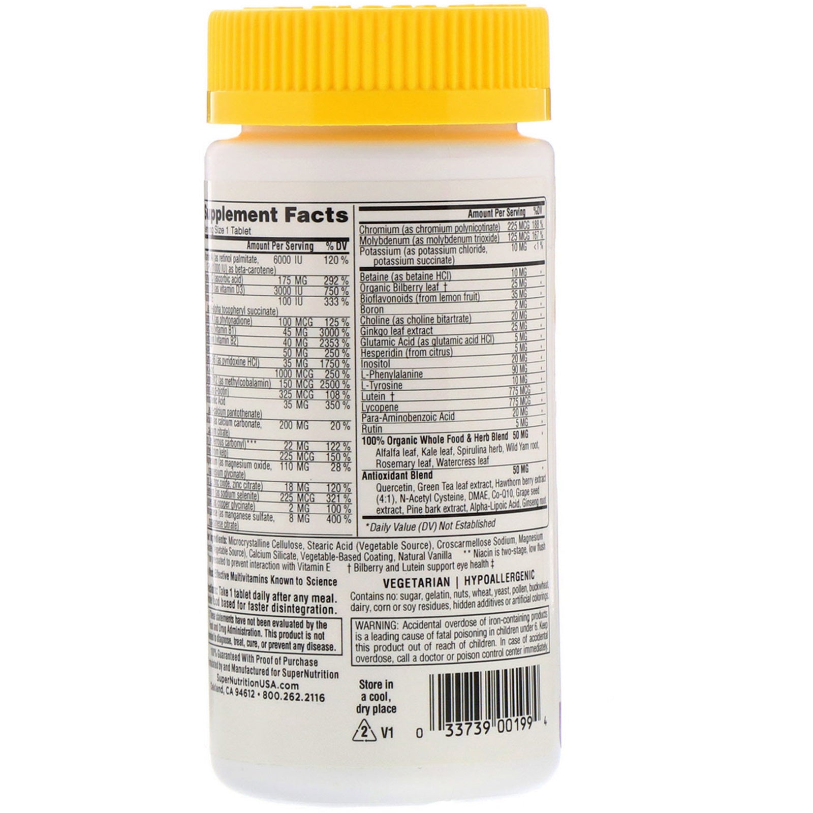 Serving Size: 1 Tablet Amount Per Serving %DV Vitamin A (as retinol palmitate, 17% (1000 IU) as beta-carotene) 6000 IU 120% Vitamin C (ascorbic acid) 175 mg 292% Vitamin D (as vitamin D3) 3000 IU 750% Vitamin E (as d-alpha tocopheryl succinate) 100 IU 333% Vitamin K (as phytonadione) 100 mcg 125% Thiamine (vitamin B1) 45 mg 3000% Riboflavin (vitamin B2) 40 mg 2353% Niacin** 50 mg 250% Vitamin B6 (as pyridoxine HCL) 35 mg 1750% Folic Acid 1000 mcg 250% Vitamin B12 (as methylcobalamin) 150 mcg 2500% Biotin (as d-biotin) 325 mcg 108% Pantothenic Acid (as d-calcium pantothenate) 35 mg 350% Calcium (as calcium carbonate, calcium citrate) 200 mg 20% Iron (as ferrous carbonyl)*** 22 mg 122% Iodine (from kelp) 225 mcg 150% Magnesium (as magnesium oxide, magnesium glycinate) 110 mg 28% Chromium (as chromium polynicotinate) 225 mcg 188% Molybdenum (as molybdenum trioxide) 125 mcg 167% Potassium (as potassium chloride, potassium succinate) 10 mg <1% Betaine (as betaine HCI) 10 mg * Organic Bilberry leaf † 25 mg * Bioflavonoids (from lemon fruit) 35 mg * Boron 2 mg * Choline (as choline bitartrate) 20 mg * Ginkgo leaf extract 25 mg * Glutamic Acid (as glutamic acid HCL) 5 mg * Hesperidin (from citrus) 5 mg * Inositol 20 mg * L-Phenylalanine 90 mcg * L-Tyrosine 10 mg * Lutein † 775 mcg * Lycopene 775 mcg * Para-Aminobenzoic Acid 20 mg * Rutin 5 mg * 100% Organic Whole Food & Herb Blend Alfalfa leaf, Kale leaf, Spirulina herb, Wild Yam root, Rosemary leaf, Watercress leaf 50 mg * Antioxidant Blend Quercetin, Green Tea leaf extract, Hawthorn berry extract (4:1), N-Acetyl Cysteine, DMAE, Co-Q10, Grape seed extract, Pine bark extract, Alpha-Lipoic Acid, Ginseng root 50 mg * *Daily Value (DV) Not Established ** Niacin is two-stage, low flush ***Iron precoated to prevent interaction with Vitamin E †Bilberry and Lutein support eye healthDisclaimer