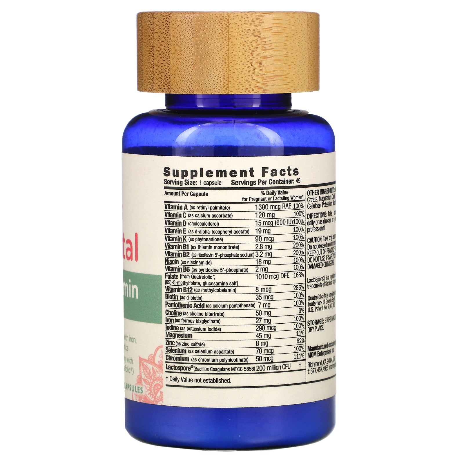 Serving Size : 1 capsule Servings Per Container: 45 Amount Per Serving %Daily Value for pregnant or lactating women* Vitamin A (as retinyl palmitate) 1300 mcg RAE 100% Vitamin C (as calcium ascorbate) 120 mg 100% Vitamin D (cholecalciferol) 15 mcg (600 IU) 100% Vitamin E (as d-alpha-tocopheryl acetate) 19 mg 100% Vitamin K (as phytonadione) 90 mcg 100% Vitamin B1 (as thiamin mononitrate) 2.8 mg 200% Vitamin B2 (as riboflavin 5'-phosphate sodium) 3.2 mg 200% Niacin (as niacinamide) 18 mg 100% Vitamin B6 (as pyridoxine 5'-phosphate)) 2 mg 100% Folate (from Quatrefolic®, (6S)-5-methylfolate, glucosamine salt) 1010 mcg DFE 168% Vitamin B12 (as methylcobalamin) 8 mcg 286% Biotin (as d-biotin) 35 mcg 100% Pantothenic Acid (as calcium pantothenate) 7 mg 100% Choline (as choline bitartrate) 50 mg 9% Iron (as ferrous bisglycinate) 27 mg 100% Iodine (as potassium iodide) 290 mcg 100% Magnesium 45 mg 11% Zinc (as zinc sulfate) 8 mg 62% Selenium (as selenium aspartate) 70 mcg 100% Chromium (as chromium polynicotinate) 50 mcg 111% Lactospore® (Bacillus Coagulans MTCC 5856) 200 million CFU † †Daily Values not established.Disclaimer