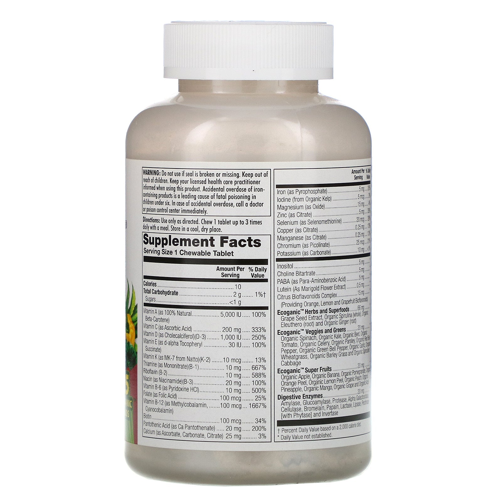Serving Size: 1 Chewable Tablet Amount Per Serving %Daily Value Calories 10 Total Carbohydrate 2 g <1%† Sugars <1 g Vitamin A (as 100% Natural Beta-Carotene) 5,000 IU 100% Vitamin C (as Ascorbic Acid) 200 mg 333% Vitamin D (as Cholecalciferol) (D-3) 1000 IU 250% Vitamin E (as d-alpha-Tocopheryl Succinate) 30 IU 100% Vitamin K (as MK-7 from Natto) (K-2) 10 mcg 13% Thiamine (as Mononitrate) (B-1) 10 mg 667% Riboflavin (B-2) 10 mg 588% Niacin (as Niacinamide) (B-3) 20 mg 100% Vitamin B-6 (as Pyridoxine HCl) 10 mg 500% Folate (as Folic Acid) 100 mcg 25% Vitamin B-12 (as Methylcobalamin, Cyacobalamin) 100 mcg 1667% Biotin 100 mcg 34% Pantothenic Acid (as Ca Pantothenate) 20 mg 200% Calcium (as Ascorbate, Carbonate, Citrate) 25 mg 3% Iron (as Pyrophosphate) 5 mg 28% Iodine (from Organic Kelp) 5 mcg 3% Magnesium (as Oxide) 15 mg 4% Zinc (as Citrate) 5 mg 35% Selenium (as Selenomethionine) 20 mcg 29% Copper (as Citrate) 0.25 mg 13% Manganese (as Citrate) 0.25 mg 13% Chromium (as Picolinate) 25 mcg 21% Potassium (as Carbonate) 10 mg <1% Inositol 5 mg * Choline Bitartrate 5 mg * PABA (as Para-Aminobenzoic Acid) 5 mg * Lutein (As Marigold Flower Extract) 0.5 mg * Citrus Bioflavonoids Complex (providing Orange, Lemon and Grapefruit Bioflavonoids) 15 mg * Ecoganic Herbs & Superfoods Grape seed extract, Organic Spirulina (whole), Organic Eleuthero (root) and Organic Ginger (root) 66 mg * Ecoganic Veggies & Greens Organic Spinach, Organic Kale, Organic Beet, Organic Tomato, Organic Celery, Organic Parsley, Organic Red Bell Pepper, Organic Green Bell Pepper, Organic Garlic, Organic Wheatgrass, Organic Barley Grass and Organic Sprouted Cabbage 20 mg * Ecoganic Super Fruits Organic Apple, Organic Banana, Organic Pomegranate, Organic Orange Peel, Organic Lemon Peel, Organic Peach, Organic Pineapple, Organic Mango, Organic Grape and Organic Acai 20 mg * Digestive Enzymes Amylase, Glucoamylase, Protease, Alpha Galactosidase, Cellulase, Bromelain, Papain, Lactase, Lipase, Pectinase [with Phytase], and Invertase 20 mg * †Percent Daily Values are based on a 2,000 calorie diet. *Daily Value not establishedDisclaimer
