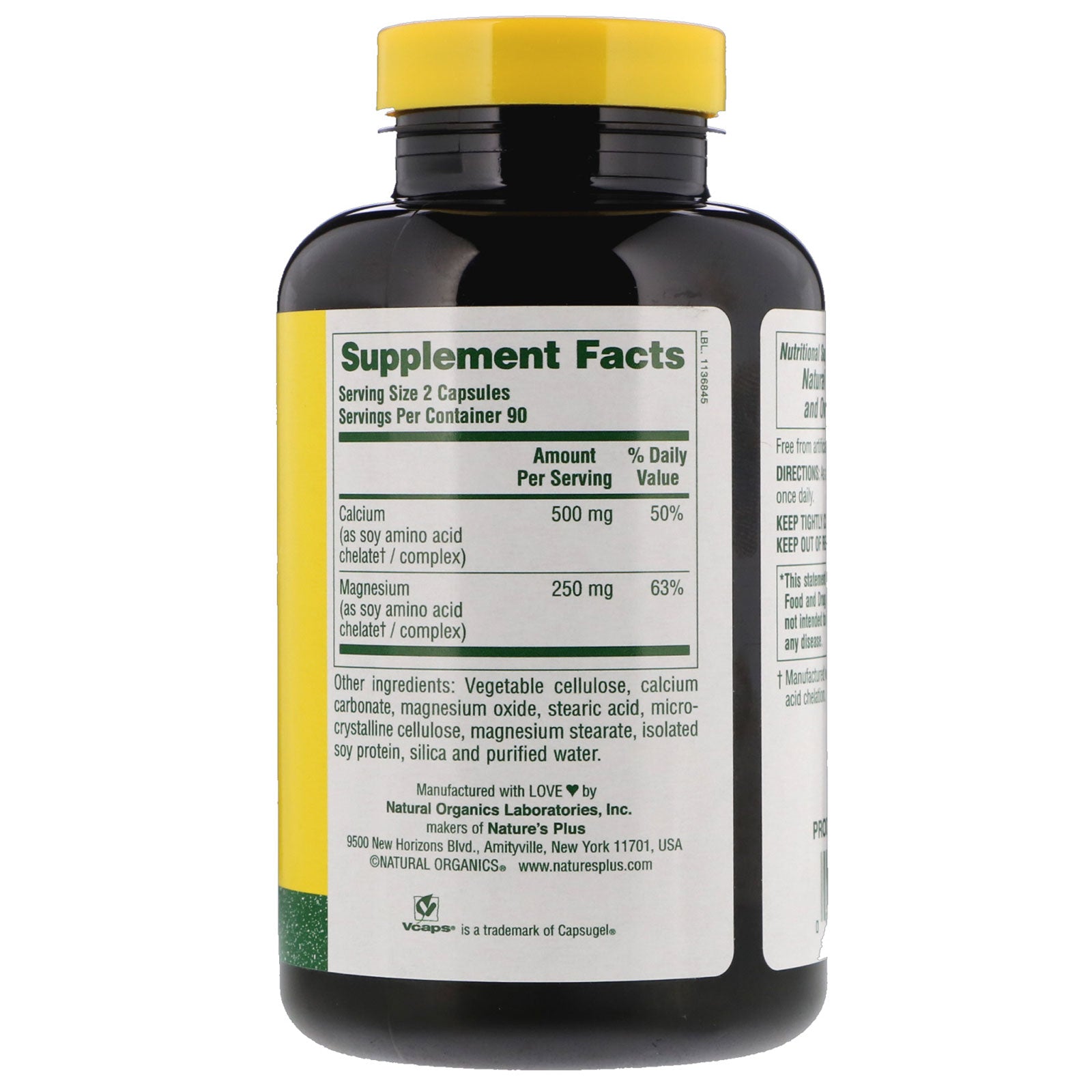 Dietary Supplement Amino Acid Chelate / Complex Gluten Free Quality Natural Supplements Nutritional Support for Healthy Bones, Natural Energy Production and Overall Well-Being.Sugg. UseAs a dietary supplement, two capsules once daily.Other IngredientsVegetable cellulose, calcium carbonate, magnesium oxide, stearic acid, microcrystalline cellulose, magnesium stearate, isolated soy protein, silica and purified water. Free from artificial colors and preservatives.Supplement FactsServing Size: 2 Capsules Servings Per Container: 90 Amount Per Serving % Daily Value Calcium (as soy amino acid chelate† / complex) 500 mg 50% Magnesium (as soy amino acid chelate† / complex) 250 mg 63%DisclaimerWhile VitaminsUK strives to ensure the accuracy of its product images and information, some manufacturing changes to packaging and/or ingredients may be pending update on our site. Although items may occasionally ship with alternate packaging, freshness is always guaranteed. We recommend that you read labels, warnings and directions of all products before use and not rely solely on the...