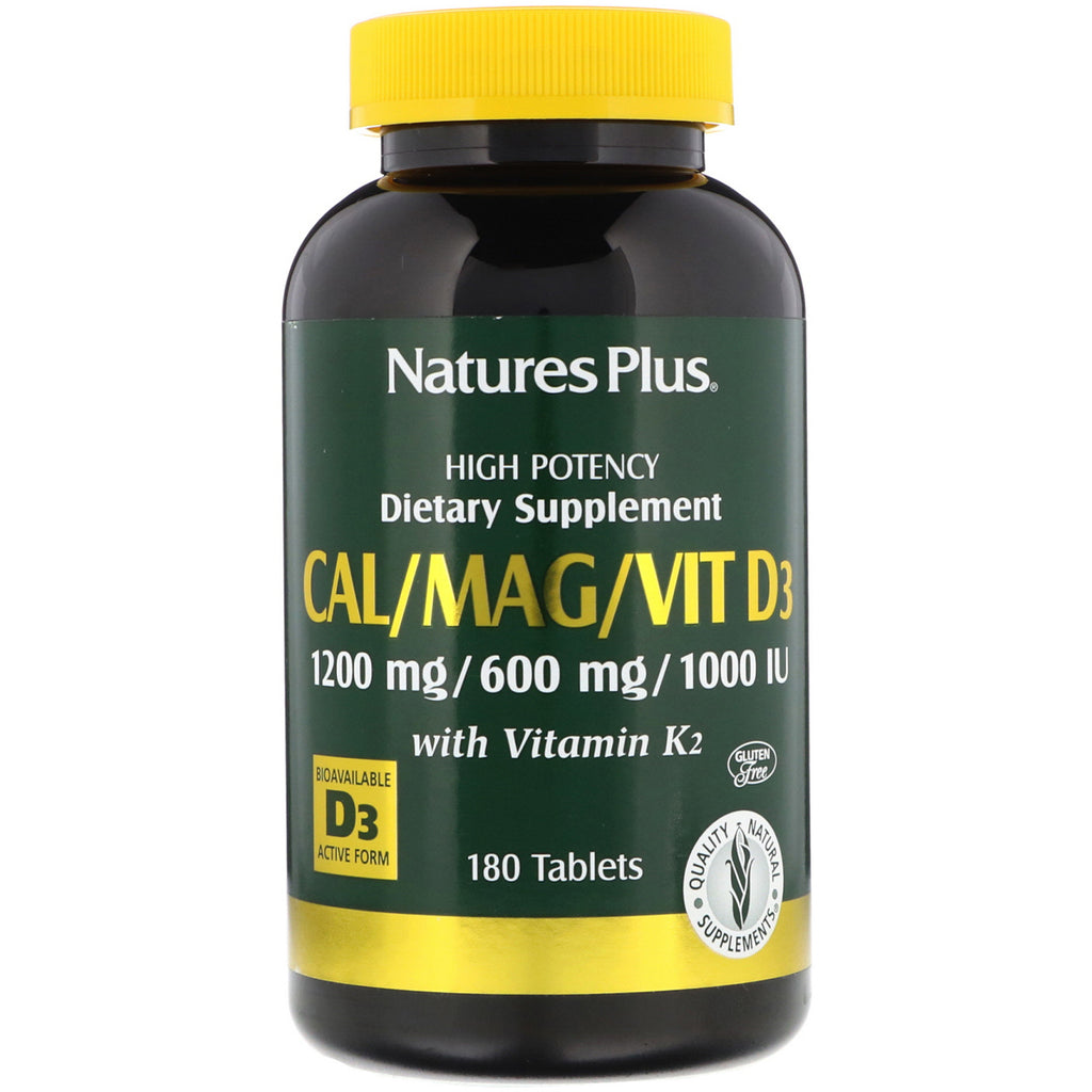 High Potency Dietary Supplement 1200 mg/600 mg/1000 IU Gluten Free Bioavailable D3 Active Form Quality Natural Supplements Purity Guaranteed - Meets Strict Government Safety Standards for Heavy Metals & Toxins Nutritional Support for Healthy Bones, Natural Energy Production and Overall Well-Being. Nature's Plus Cal / Mag / Vit D3 with Vitamin K2 fuses core synergistic essential nutrients for unparalleled bone health support. Biotron-chelated calcium and magnesium work dynamically with the most powerful, most bioavailable forms of vitamin D3 and Vitamin K2. Nature's Plus Cal / Mag / Vit D3 with Vitamin K2 conforms to the strictest standards for purity including California's Proposition 65.Sugg. UseAs a dietary supplement, four tablets daily.Other IngredientsCalcium carbonate, vegetable cellulose, stearic acid, di-calcium phosphate, microcrystalline cellulose, silica, magnesium stearate and pharmaceutical glaze. Contains soy. Free from artificial colors and preservatives. Free from the common allergens yeast, wheat, corn and milk.Supplement FactsServing Size: 4 Tablets Servings per...