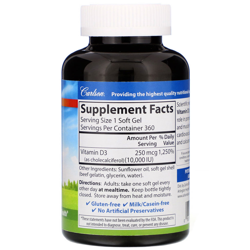 Carlson Labs, Vitamin D3, 10,000 IU (250 mcg), 360 Soft Gels