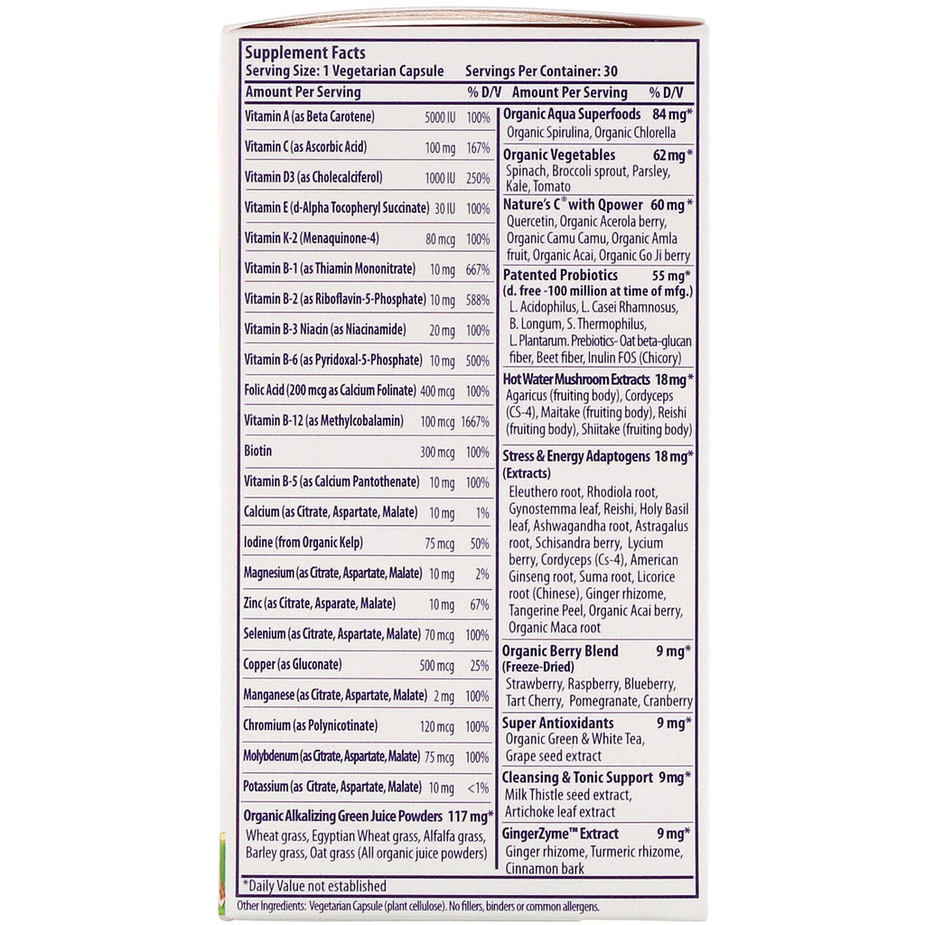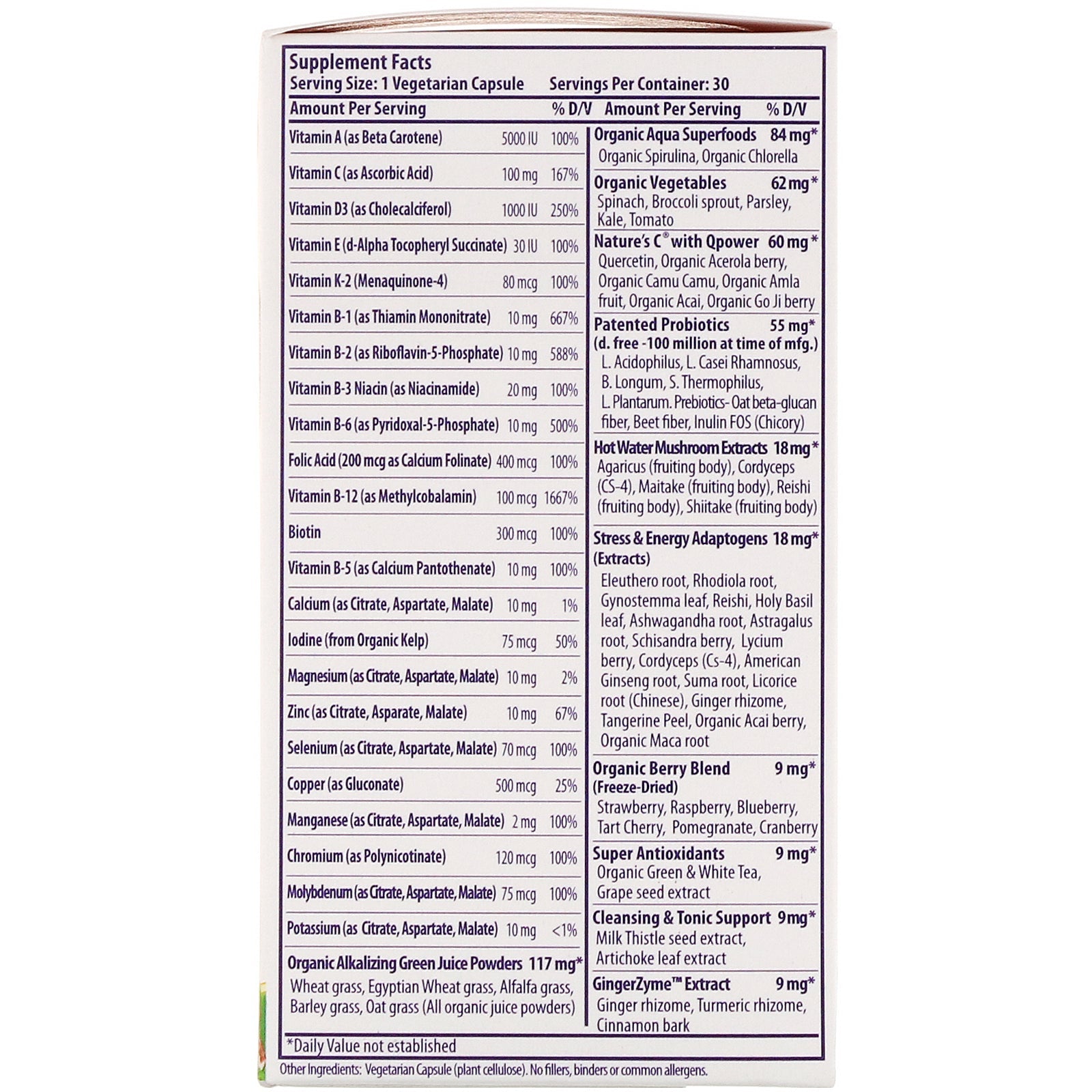 Serving Size: 1 Vegetarian Capsule Serving Per Container: 30 Amount Per Serving %D/V Vitamin A (as Beta Carotene) 5000 IU 100% Vitamin C (as Ascorbic Acid) 100 mg 167% Vitamin D3 (as Cholecalciferol) 1000 IU 250% Vitamin E (d-Alpha Tocopheryl Succinate) 30 IU 100% Vitamin K-2 (Menaquinone-4) 80 mcg 100% Vitamin B-1 (as Thiamin Mononitrate) 10 mg 667% Vitamin B-2 (as Riboflavin 5-Phosphate) 10 mg 588% Vitamin B-3 Niacin (as Niacinamide) 20 mg 100% Vitamin B-6 (as Pyridoxal-5-Phosphate) 10 mg 500% Folic Acid (200 mcg as Calcium Folinate) 400 mcg 100% Vitamin B-12 (as Methylcobalamin) 100 mcg 1667% Biotin 300 mcg 100% Vitamin B-5 (as Calcium Pantothenate) 10 mg 100% Calcium (as Citrate, Aspartate, Malate) 10 mg 1% Iodine (from Organic Kelp) 75 mcg 50% Magnesium (as Citrate, Aspartate, Malate) 10 mg 2% Zinc (as Citrate, Aspartate, Malate) 10 mg 67% Selenium (as Citrate, Aspartate, Malate) 70 mcg 100% Copper (as Gluconate) 500 mcg 25% Manganese (as Citrate, Aspartate, Malate) 2 mg 100% Chromium (as Polynicotinate) 120 mcg 100% Molybdenum (as Citrate, Aspartate, Malate) 75 mcg 100% Potassium (as Citrate, Aspartate, Malate) 10 mg < 1% Organic Alkalizing Green Juice Powder s Wheat grass, Egyptian Wheat grass, Alfalfa grass, Barley grass, Oat grass (All organic juice powders) 117 mg * Organic Aqua SuperFoods Organic Spirulina, Organic Chlorella 84 mg * Organic Vegetables Spinach, Broccoli sprout, Parsley, Kale, Tomato 62 mg * Nature's C with Qpower Quercetin, Organic Acerola berry, Organic Camu Camu, Organic Amla fruit, Organic Go Ji berry 60 mg * Patented Probiotics (d. free-100 million at time of mfg.) L. Acidophilus, L. Casei Rhamnosus, B. Longum, S. Thermophilus, L. Plantarum. Prebiotics-Oat beta-glucan fiber, Beet fiber, inulin FOS (Chicory) 55 mg * Hot Water Mushroom Extract s Agaricus (fruiting body), Cordyceps (CS-4), Maitake (fruiting body), Reishi (fruiting body), Shiitake (fruiting body) 18 mg * Stress & Energy Adaptogens (Extracts) Eleuthero root, Rhodiola root, Gynostemma leaf, Reishi, Holy Basil leaf, Ashwagandha root, Astragalus root, Schisandra berry, Lycium berry, Cordyceps (Cs-4), American Ginseng root, Suma root, Licorice root (Chinese), Ginger rhizome, Tangerine Peel, Organic Acai berry, Organic Maca root 18 mg * Organic Berry Blend (Freeze-Dried) Strawberry, Raspberry, Blueberry, Tart Cherry, Pomegranate, Cranberry 9 mg * Super Antioxidants Organic Green & White Tea, Grape Seed extract 9 mg * Cleansing & Tonic Support Milk Thistle seed extract, Artichoke leaf extract 9 mg * GingerZyme Extract Ginger rhizome, Turmeric rhizome, Cinnamon bark 9 mg * * Daily Value not established.Disclaimer